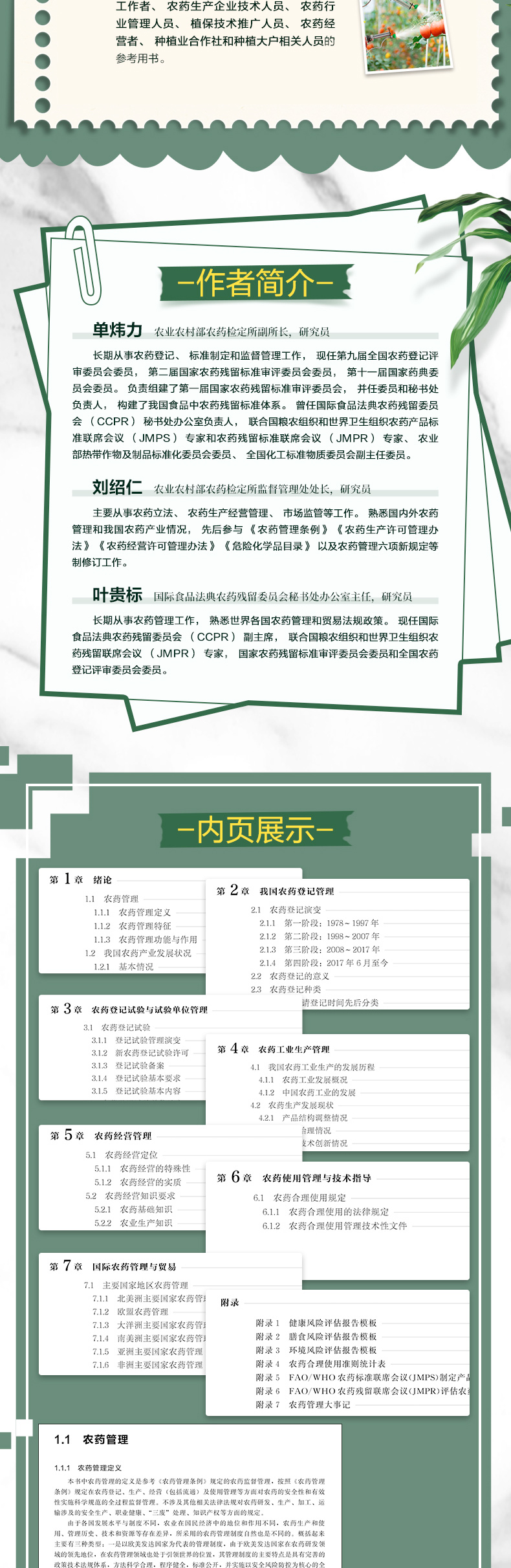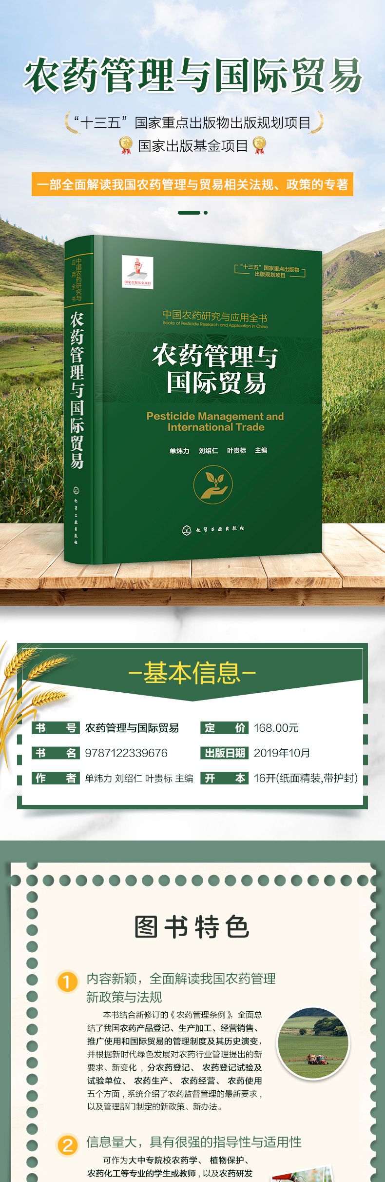 1.本书为国家出版基金项目、十三五国家重点出版物规划项目-《中国农药研究与应用全书》其中一分卷,主要系统介绍了我国农药管理与国际贸易领域的新政策、新方法; 2.本书以新修订的《农药管理条例》为蓝本,全面总结了我国农药产品登记、生产加工、经营销售、推广使用和国际贸易的管理制度等内容;具有极高的指导性与参考性。 3.本书内容丰富全面,具有很强的可读性。