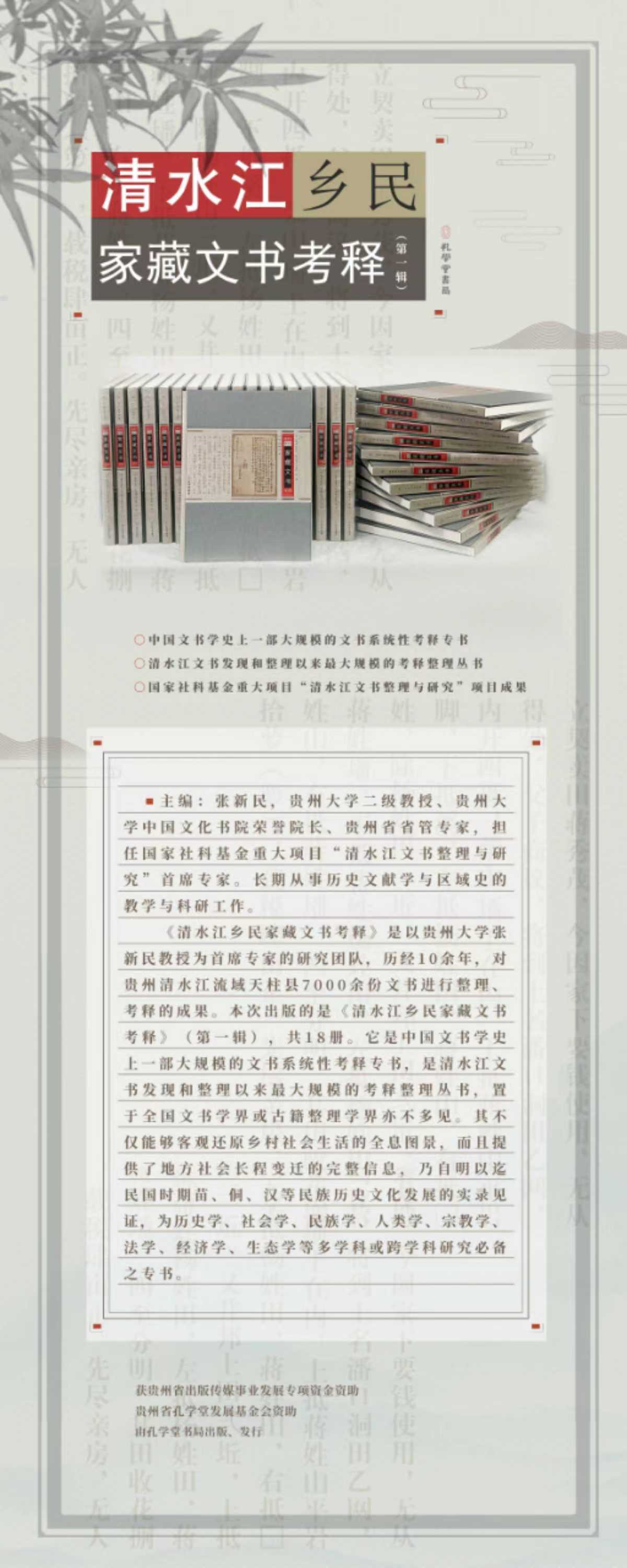 丛书是首部大型清水江文书编纂出版的考释类文图对照图书,是清水江文书发现和整理以来最大规模的考释整理丛书,也是中国文书史上一部大规模的文书系统性考释专书。其不仅能够客观还原乡村社会生活的全息图景,而且提供了地方社会长程变迁的完整信息,乃自明以迄民国时期苗、侗、汉等民族历史文化发展的实录见证,为历史学、社会学、民族学、人类学、宗教学、法学、经济学、生态学等多学科或跨学科研究必备之专书。