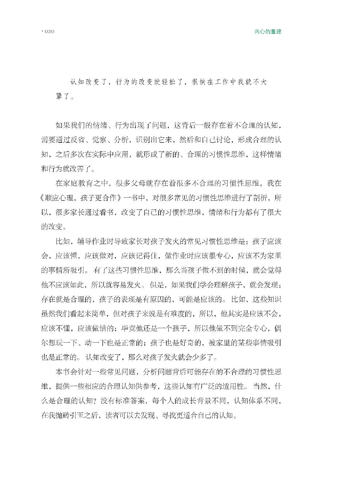 **序1 人生是一场长跑 方 敏**序2 做自己心理的主人 王占郡 **序3 合理的认知,全新的生活 海夫人 自 序 美好人生,从改善认知开始**章 心理成长,需要科学指导01 感谢曾困扰过我的心理问题02 改变认知,走出自卑黑洞03 发现自己的本性,做自己就好04 情绪本身并无好坏之分05 依靠意志能解决心理问题吗第二章 心理成长的钥匙:认知疗法01 认知疗法很简单02 神秘的自动化思维03 抵御伤痛、焦虑的认知防火墙04 识别情绪、行为背后的认知05 为什么改变认知并不容易06 为什么明知不该追求**,却做不到07 不合理的认知体系,使改变不易发生08 识别深层认知,说服自己去改变09 慢慢等待开悟第三章 内心强大的神器:三种思维01 学会三种思维,收获真正坚强02 三种思维1:坏事变好事03 三种思维2:很正常,没什么04 三种思维3:顺其自然05 学会三种思维,做到实事求是06 看似简单,却是解脱的法门07 自我觉察,改变不合理思维08 认知疗法的局限性第四章 影响我们的神秘力量:驱力01 当时忍住就好了—— 人为何难以自控02 意志并非**主宰—— 常见驱力来源03 如何通过驾驭驱力,提高自控力04 克服拖延症,需要综合解决方案第五章 少有人掌握的情绪奥秘01 情绪为什么有时不*意志的控制02 坏情绪会致病:情绪与身体健康03 认知影响情绪,情绪也会影响认知04 觉察**情绪来袭,及时转移注意力05 若想*好自控,就不要让情绪累积06 及时宣泄和倾诉,寻求心理支持07 当沮丧来临,当紧张来袭08 解决严重情绪困扰,需要多管齐下第六章 童年会伤人,如何看待环境影响01 改变认知之后,还需要解决问题02 环境塑造人,超然物外并不容易03 换个环境,改变会*容易发生04 心理成长,需要讲究方法05 不困不启,怎样看书才管用06 建立合理思维,培养率直的心胸07 家庭会伤人,放下童年经历的影响08 运用三种思维,学会理解父母09 不要夸大童年对性格心理的影响10 过去的经历常常会沉淀为认知第七章 为什么说成功学害人不浅01 成功学是一把双刃剑02 错误的成功学认知让人烦躁焦虑03 过度追求成功,有时是侥幸的**04 只要努力,梦想就一定会实现吗05 合理设立目标,努力之后顺其自然06 事物有其自身规律,切莫太执着07 领悟不二法门,不再焦虑纠结08 淡定从容:体会不勉强的妙处09 面对压力,从容淡定的秘诀10 如何识别不合理的习惯性思维11 如果你有过于追求**的倾向12 找不到目标,如何度过青春的迷茫第八章 接纳不**的自己01 只要是人,就会不**02 找回真实的自己,真正自我接纳03 放过自己,不必太苛责04 理解自己,放下过多自责05 面对批评,如何做到淡定自若06 对于别人,我们只能负有限的责任07 做真实的自己,我们就可以爱自己08 改变需要时间,带着问题去生活09 接纳自己,放下道德洁癖第九章 顺其自然的人生态度01 以幸福为出发点,一切都豁然开朗02 顺其自然,才会有顺心如意的感觉03 以出世的精神做入世的事业04 现实就是答案,不和事实较劲05 转念之间,收获幸福、自在06 面对懊悔我们该怎么想07 如何减少不必要的忧虑08 我们要努力进取,也要随遇而安09 舍与得:放下不必要的执着10 学会欣赏别人,同时安然做自己第十章 如何有效改善性格01 改善性格,从转换认知开始02 怎样才能不再那么脆弱敏感03 改变急脾气,没有那么难04 人际交往中如何做到自然05 建立做事果断的思维模式06 如何做到说话办事有底气07 理直气壮的尺度08 建立自信,需要系统的方法09 恪守美德,实则对自己有益10 宽容的基础在于理解第十一章 建立良好的人际关系01 人际交往的关键是理解别人02 这不是一个非黑即白的世界03 有些不过是人之常情04 理解别人,说到底是为了自己05 别太较真,保持适度自我怀疑06 掌握沟通的秘诀07 先理顺关系,再寻求改变08 改变认知,理解对方09 学会三种思维,收获平常心10 没有什么是“你应该”11 先改变自己,进入良性循环第十二章 心理问题是可以理解的01 抑郁症是怎么回事儿02 强迫症,其实不难理解03 克服恐惧,需要方法04 摆脱失眠的阴影05 如何解决紧张性头痛06 别被轻易扣上精神疾病的帽子后 记 认知变,世界变 1.不破不立,唯有重建,才能提升你的人生格局!2.心灵成长导师维尼老师思索27年、书写7年心理成长**心法! 3.觉察和自省是一切成长的开始。——张德芬4.**心理专家方敏,教育专家海文颖、刘称莲、贾容韬、海夫人等走心**! 潜心从事心理学研究20余年,进行一线心理咨询10多年,积累了大量案例后,维尼老师发现:每个人都需要内心重建!大多数人的情绪、行为问题背后存在着相似的习惯性思维!人们都是依靠这种惯性生活着。而通过深入改变认知,可以**解决情绪、行为背后的隐含诉求,从而进行内心重建,把自我升级到*高维度。**情绪管理专家海蓝博士认为,“通过改变认知,改变情绪和行为”这一方法**有效。 5.未经省察的人生不值得一过。——苏格拉底 只有通过不断反省,学会觉察自己**的思维、行为模式,放下已有的东西,我们才有机会吸收和接纳新的东西。这也像死去和重生,我们的思想,就在这种解体、重构的过程中,不断进化。改变认知,内心重建,才能重塑生命!