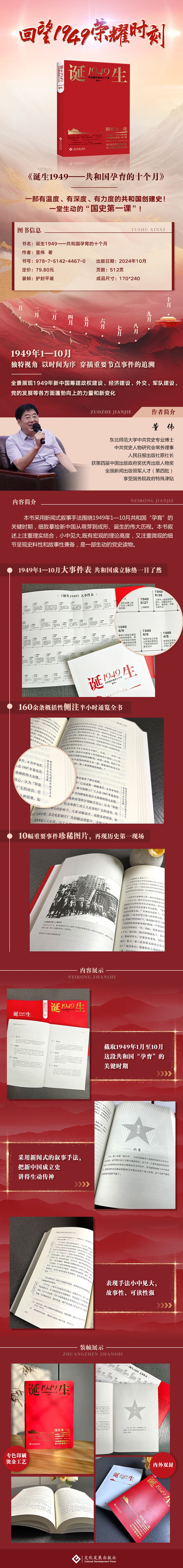 ·160余条概括性侧注,半小时通览全书 ·10幅重要事件珍惜图片,再现历史第一现场 ·1949年1—10月大事件表,共和国成立脉络一目了然 2024年正值中华人民共和国成立75周年,在这样一个具有纪念意义的时刻,以读者需要深入、系统地了解新中国成立的历程,回顾那段波澜壮阔的历史,以更好地铭记过去、珍惜现在、展望未来为契机,出版本书是对这一时刻的充分展示,满足了社会大众对于了解共和国创建史的需求。 普及党史教育:是一部优秀的党史普及读物,为广大读者,尤其是青少年提供了一个了解共和国创建史的窗口,帮助读者更好地理解新中国成立的历程,增强对国家历史和文化的认同感,培养正确的历史观和价值观,对于推动全民历史教育具有重要意义,堪称经典的 “国史教育第一课”。 彰显文化自信:通过对新中国孕育历程的深入挖掘和生动展现,充分展示了中华民族的伟大智慧和创造力,以及中国共产党领导人民取得胜利的必然性。这种对历史的深刻理解和自信展示,有助于增强人们的文化自信,在全球化的时代背景下,更加坚定地坚守和弘扬中华民族的优秀文化传统。 传承和弘扬精神:有助于传承和弘扬中国共产党和老一辈革命家在共和国孕育过程中展现出的坚定信念、艰苦奋斗、勇于创新等精神。让读者深刻体会到革命先辈们为实现民族独立、人民解放所付出的巨大努力,激发人们的爱国热情和民族自豪感,激励后人在新时代继续传承和发扬这些精神,为实现中华民族伟大复兴中国梦而不懈奋斗。 展现事件细节:通过对这十个月中重要战争、政权建设、外交、军队建设、党的喉舌《人民日报》发展历程、开国大典等多方面内容的详细描述,丰富了人们对共和国创建史的认知,不仅展现了重大历史事件,还穿插大量细节,如人民海军的筹建、新中国国旗的确定过程、开国大典现场的情景等,呈现出有血有肉、丰满立体的历史画卷,让读者能够更全面、深入地了解共和国孕育的背景和过程。 呈现生动历史:以近似日记体的纪实手法,选取1949年1月1日至10月1日期间与新中国筹建有关的重要历史事件进行叙述,清晰地勾勒出新中国从萌芽一步步发育,最后成型诞生的过程。摆脱了学术史的沉重,却又保留了信史的翔实可靠,同时兼具故事性,让读者仿佛亲历历史,使历史变得鲜活生动,增强了历史的感染力和可读性。