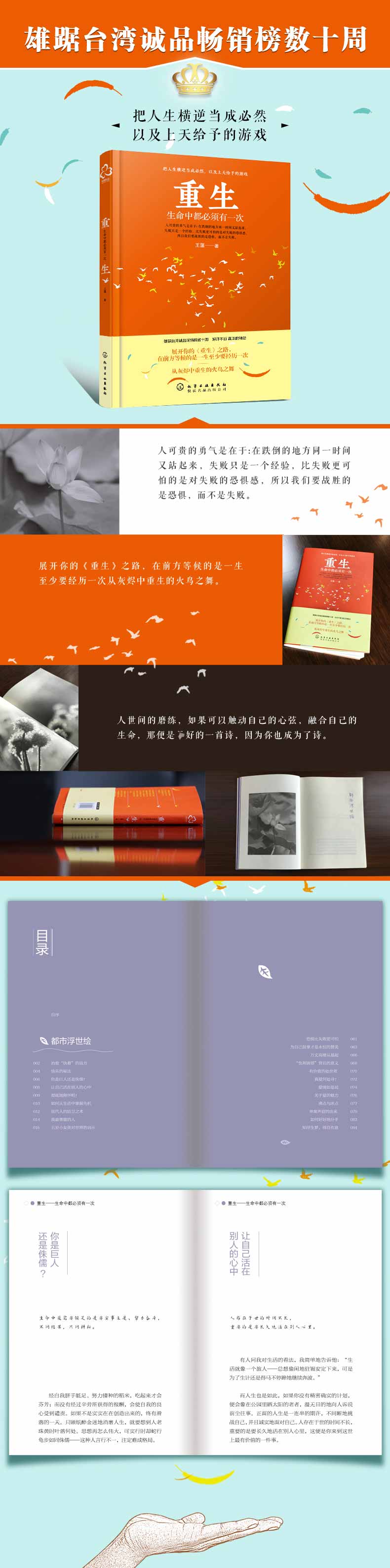 治愈“执着”的良方 人的眼睛因为贴着花朵,所以看到的世界便会如 同看到万花筒般的幻境;人的耳朵因为常常有作响的 声音,所以才会虚妄地觉得一切的声音都是真实的。 人们也因为时时刻刻心中存在着各式各样的想象,所 以才会觉得万事万物都是真实的。而人类的执着,也 正是从这些地方开始,一点一滴所累积起来的。 不少人想丢弃生命中的包袱,但尝试了各式各样 的方法却总是无疾而终,于是问我怎么办。我只能告 诉他:“与其终生说同一句话,不如从现在开始放下 ,从可以做到的小事情开始。如果你每天都把时间浪 费在追求‘执着’这件小事上,那你很可能面临下一 次的失败。” 快乐的秘法 高强度的压力从我们小的时候,一直延续到我们 的下一代,和他们的生活紧密地融合在一起。不正确 的制度化,成为蕴育忧郁、躁郁的土壤,习惯追求完 美,全部都要做对,追不上时尚是一种羞耻……这些 便是*教育时期因压力而形成的不健康认知。 半世纪的延续所造成的结果,使大多数人缺乏安 全感、无法独当一面;安于现状、无法面对挑战;不 知道开创和突破是何物。太多的人每天都在和我谈这 些,却又不知道如伺去解决这些障碍。我只能说,卸 下虚伪的面具,认真地给自己改变的时间跟空间,并 且勇于接*别人对你的批判和修正,*重要的要感谢 家庭、朋友一直默默地承*你从小到大的所有缺陷与 恶习。 如果你能够很诚实地察觉到,你的不快乐来自于 放不下自我和不重要的尊严,那就请你试着改变自己 ,用放下和包容再给自己一次机会吧! 你是巨人还是侏儒? 经自我胼手胝足、努力播种的稻米,吃起来才会 芬芳;而没有经过辛劳所获得的报酬,会使自我的良 心*到谴责。如果不是实实在在创造出来的,终有滑 落的**。只顾纸醉金迷地消磨人生,就要想到人老 珠黄时叶落何处。思想再怎么伟大,可实行时却蛇行 龟步如同侏儒一这种人言行不一,注定难成格局。 生命中*需要俱足的是要实事求是、努力奋斗, 不问结果,只问耕耘。应量入为出,开源节流地谨慎 行事,同时也要言行如一,不能虎头蛇尾,落人话语 。如此的人生才称得上是踏实。 让自己活在别人的心中 有人问我对生活的看法,我简单地告诉他:“生 活就像一个旅人——总想偷闲地驻锡安定下来,可是 为了生计还是得马不停蹄地继续奔波。”而人生也是 如此,如果你没有精密确实的计划,便会像在公园里 晒太阳的老者,漫无目的地向人诉说前尘往事。正面 的人生是一连串的期许,不间断地挑战自己,并且诚 实地面对自己。人存在于世的时间不长,重要的是要 长久地活在别人心里,这便是你来到这世上*有价值 的一件事。 **地释怀吧! 经常有学生向我抱怨,因为年纪大了,自己便很 后悔没有好好把握过去的时光,而现在一切都太迟了 !我这一生大概就这样子了。有些学生干脆就说:“ 我当初如果……现在就会……” 人的一生不短也不长,你在寻找什么答案,千万 不要问别人,因为别人也在寻找答案。对待自己的人 生*宽厚的方法,就是不要回首走过的路,这些就交 给大自然的风吹尘动吧!只管抖落剩余的尘埃,不顾 一切地再度向前!想要让自己看得*透彻、心胸*开 阔,**的方法就是感谢你所经历的一切。唯有这样 ,你才有办法做到**释怀,从而真正地放下。 如何从生活中掌握先机 对于当代人来说,*大的烦恼应该就是生活中越 来越多的变化。由此,越来越多的人对于目前的生活 都有一种无力感,这是比身体上的疾病*为严重的问 题。 缺乏安全感主要是因为失败的经验和自信心的不 足,再加上人与人之间的疏离,社会问题越来越多地 发生,使得街头上的大多数人都显得神色匆匆、忧愁 、紧张、愤怒……很多人都期盼生命中会再度出现贵 人或精神导师的指引,但结果往往令他们失望的。 现代人*大的问题是喜欢沉浸在过去,让自己享 *伤感和慵懒。因此,现代人*缺乏的便是专注力和 应变力。我们都必须了解,在有如海啸般的现实生活 中,改变力和适应力强的人,便是这个时代中可以掌 握先机的人。 P2-11