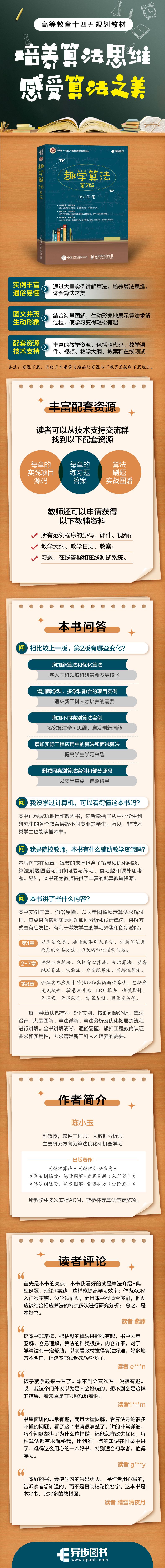 本书从算法之美娓娓道来,没有高深的原理,也没有枯燥的公式,通过趣味故事引出算法问题,包含50多个实例及海量图解,结合学生提问,分析算法本质,并给出代码实现的详细过程和运行结果。 本书的特色和价值: (1)实例丰富,通俗易懂 从有趣的故事引入算法,结合大量实例讲解,从简单到复杂,使读者从实例中体会算法设计思想。 (2)海量图解,简单有趣 通过海量图解,对算法进行分解剖析,使复杂难懂的问题变得简单有趣,给读者带来巨大的阅读乐趣,在阅读中不知不觉地学到算法知识。 (3)深入浅出,透析本质 用关键代码描述算法,既简洁易懂,又能抓住本质;算法思想描述及注释使代码更加通俗易懂。对算法的分析丰富细致,既有逐步推导结论的过程,又有直观绘图展示。 (4)实战演练,循序渐进 每个算法讲解后会进行实战演练,提高读者独立思考能力和动手实践能力 (5)网络资源,技术支持 丰富的教学资源,包括源代码、教学课件、视频、教学大纲、教案、习题、在线答疑和在线测试。 (6)算法解析,优化拓展 进行详细的算法解析,分析算法的时间复杂度和空间复杂度,并对其优化拓展进一步讨论,提出优化算法。 (7)本书自上市以来,不但得到读者的认可,也在许多高校作为教材使用,已经被评为十四五规划教材。