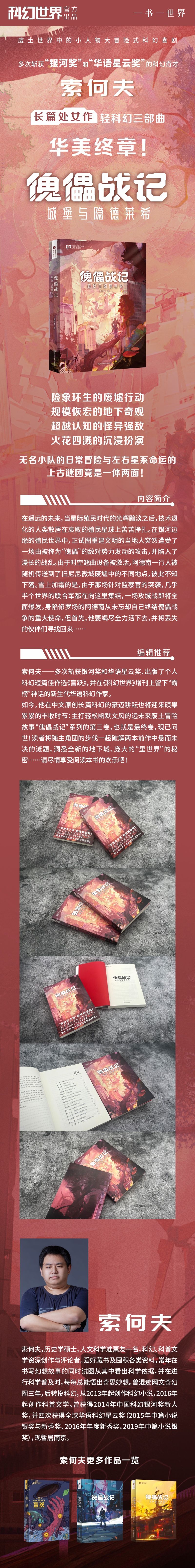 虽说兰檀是一个以炎热潮湿而闻名的地方,但在黄昏降临时,只穿着一件破破烂烂的衬衫和一条短裤的我还是冷得牙齿打战——当然,我目前所处的位置也在一定程度上加剧了这种状况。我正趴在一段通风管的尽头,从管道另一侧涌入的凉风持续不断地从我身旁刮过,透过我裸露的皮肤将热量吸走,而管道内狭窄的空间对气流起到的加速作用更是大大地加快了我的身体失温的速率,让我的皮肤上冒出一片片的鸡皮疙瘩。 不过,我仍然决定留在这儿。 尽管这地方又冷又湿、让人很不舒服,但也有个非常明显的好处:透过装在通风管末端的满是锈迹的金属格栅,可以清楚地看到对面大厅中的景象——在这座阴暗的地下大厅内,两堆柴火烧得正旺,在柴火上方,两只起码已经有近半个世纪历史的大号金属燃料桶架在摆成环形的石灶上。在刚被造出来时,这些一米多高的大桶自然是用来装运用于供应军队的燃料的,但现在,满满两桶热水在昏暗的地下空间中不断散发着惨白的水汽。 我现在身边仅剩的两位同伴,正把大半个身体浸泡在这对装满热水的大桶里。 好吧,这看上去很像是在野外远足时触发了特殊事件,然而实际情况根本不是这个画风。 自打在两天前因为完全无法理解(但肯定和我们老祖宗的科学技术有关)的原因而被扔到了这座大名鼎鼎的废墟城市、原兰檀首府旧尼尼微城后,我们就像没头苍蝇似的一直四处乱撞,希望先找到其他失散同伴再做打算。不幸的是,在这座饱经战火荼毒的巨大城市中,我们头几个小时的搜索不但几乎一无所获,反倒还好几次身临险境。因此,我们不得不找了一座看上去似乎曾是地下仓库或者停车场的建筑,在里面暂时隐蔽起来,等到夜幕降临后再悄悄溜出去碰运气。 我必须得补充一点:在我们事前的计划中,一切本不该是这样的。 在四十五年前的那场毁灭性战役后,除了极个别胆大包天、做着从废墟中搜刮财物的白日梦、把脑袋别在裤腰上冒险潜入这儿的拾荒者外,几乎不会再有别人胆敢闯进据称仍被傀儡军团占据着的旧尼尼微城废墟——闯入者大多一去不回。不过,按照负责为我们出谋划策的历史学家伊斯坎德尔?罗蒙诺索夫的计划,这些麻烦对我们而言不成问题:首先,我们手中拥有一辆同样出于傀儡之手,而且基本功能正常的“基路伯”超重型坦克;其次,我随身携带的一支被称为“信标”(当然,它在其他人口中还有一些别的称谓)的古代技术设备能让我像幽灵上身般将自己的意识暂时“附”在某个特定的傀儡身上。历史学家宣称,有了这两样法宝,要在旧尼尼微城废墟里自由行动就会像在自家后院散步一样轻松,如果真的有傀儡战士跳出来阻拦我们,我只需要开动“信标”、暂时制住其中一个,再从对方的表层意识里搜出敌我识别码就行了。在那之后,我们要做的就是穿上傀儡们的盔甲和战斗服,乘着开启了敌我识别系统、能够让对方相信我们是自己人的“走为上二号”在城里慢慢晃悠,直到成功地找到奥菲莉亚失踪的妹妹,以及据说会左右这个世界命运的、被谢林家族的祖先隐藏在这座城市地下的古老秘密。 无论从哪个角度来看,这个计划都相当精明、非常完美,充分体现了“最危险的地方就是最安全的地方”这一颠扑不破的真理……唯一的问题是,由于客观局势的变化,它目前已经变得毫无意义:我们那可怜的“走为上二号”目前正躺在新阿斯旺湖冰冷黑暗的湖底,而这座城市里的敌人也早已不只是那些傀儡了。 在近半个世纪的漫长等待与僵持之后,联合军终于对旧尼尼微城废墟发起了主动进攻。 索何夫——多次斩获银河奖和星云奖、出版了个人科幻短篇佳作选《盲跃》,并在《科幻世界》增刊上留下“霸榜”神话的新生代华语科幻作家。 如今,他在中文原创长篇科幻的豪迈耕耘也将迎来硕果累累的丰收时节:主打轻松幽默文风的远未来废土冒险故事“傀儡战记”系列的第三卷,也就是最终卷,现已问世!读者将随主角团的步伐一起破解两本前作中悬而未决的谜题,洞悉全新的地下城、庞大的“里世界”的秘密……请尽情享受阅读本书的欢乐吧!