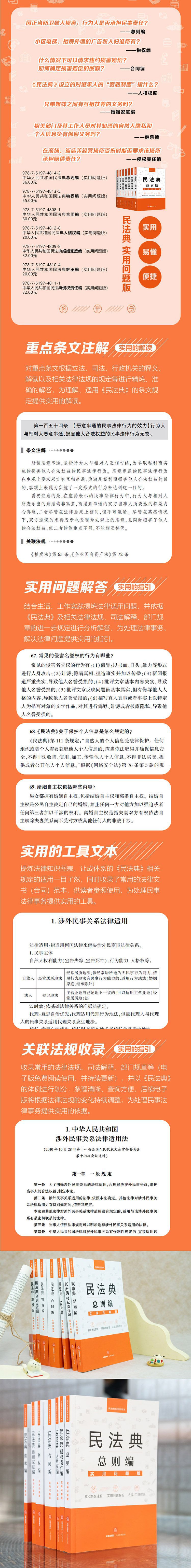 重点条文注解:对重点条文根据立法、司法、行政机关对条文的释义和解读以及相关法律法规的进一步规定进行精炼、准确的解答,为理解、适用民法典的条文规定提供实用的解读 实用问题解答:结合生活实践提炼法律适用问题,并依据民法典及相关法律法规进行分析解答,为处理法律事务、解决法律问题提供实用的指引 实用工具文本:提炼法律知识图表,并收录常用的法律文书(合同)范本,为处理民事法律事务提供实用的工具 关联法规收录:收录常用的法律法规、司法解释、部门规章等(电子版免费阅读使用,并持续更新),为处理民事法律事务提供实用的依据