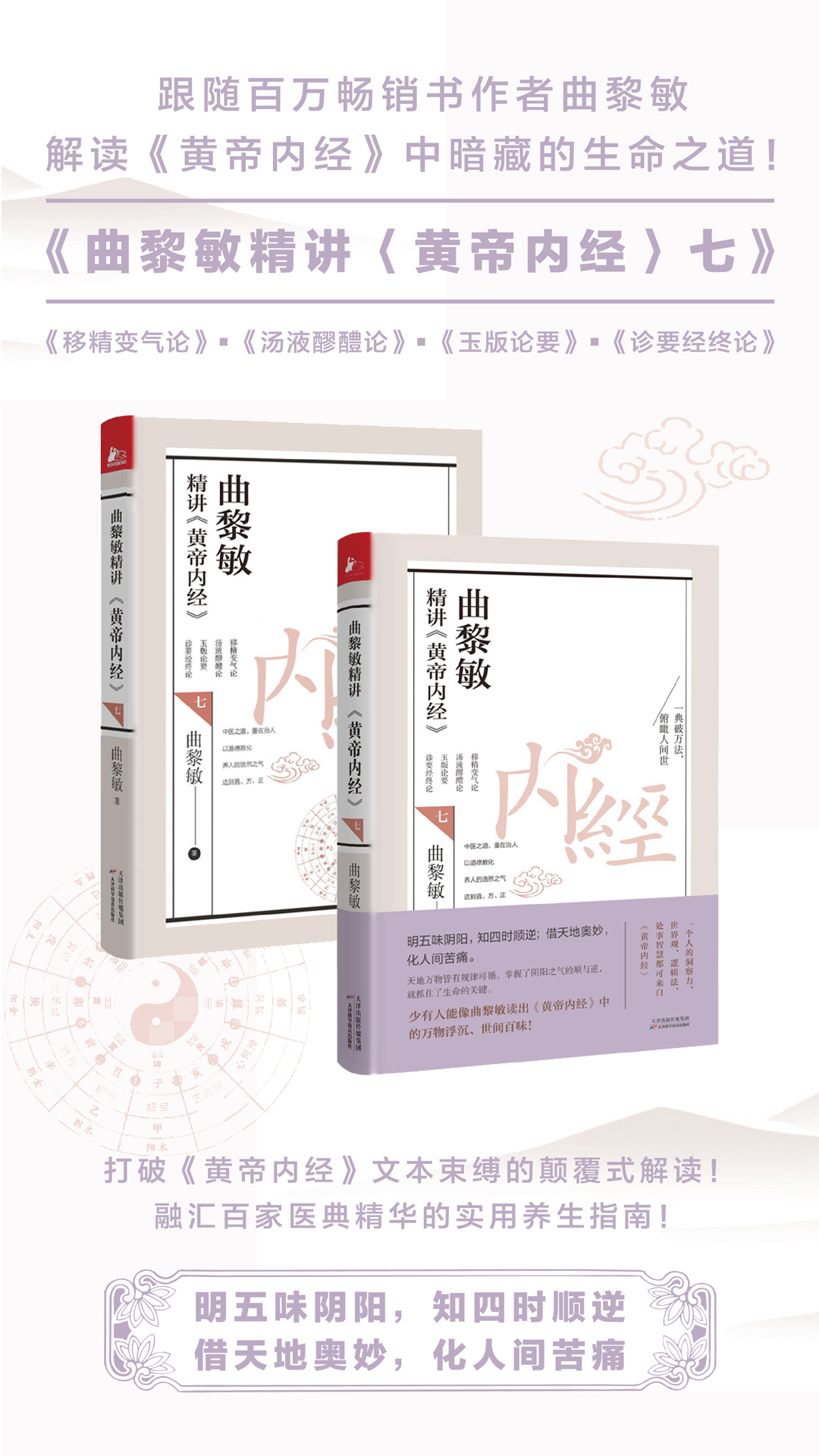 ●《移精变气论》——论述了移精变气的祝由法;说明了诊察色脉的重要意义。 ●《汤液醪醴论》——分析了汤液和醪醴在古代和今时治病效用不同的原因。 ● 《玉版论要》—— 介绍几部古代的医学书籍,再次阐述了望色与脉诊的意义。 ● 《诊要经终论》——讲述诊法要领,分别说明十二经气绝的表现。 ● 逐字逐句讲解《黄帝内经》原文,零基础、不学医,也能读懂,也能受益 ● 结合生活实例、临床病例,让读者更真切、深入地理解病理、症候、治疗和保养方法 ● 喜马拉雅付费课程“曲黎敏精讲《黄帝内经》系列”播放量3300万+,传播广,预热足 ●《曲黎敏精讲〈黄帝内经〉》系列图书(一、二、三、四、五、六),热销几十万册,粉丝黏性大,续购率高 ● 精讲《黄帝内经》,涉及《伤寒论》《金匮要略》《难经》等中医经典、《诗经》《说文解字》《大学》《中庸》等国学经典,养生之道更在修身养性