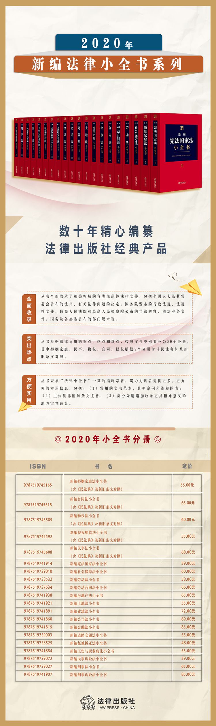 本丛书具有以下特点: 1.突出热点。本丛书根据法律适用的重点、热点和难点,按照文件类别共分为20个分册,其内容涵盖了宪法国家法、征地拆迁、公司、金融、土地、房地产、建筑、道路交通、劳动、社会保障、婚姻家庭、民事、物权、合同、侵权赔偿和刑事等诸多法律部门。 2.全面收录。本丛书全面收录了相关领域的各类规范性法律文件,包括全国人大及其常委会公布的法律、有关法律问题的决定,国务院发布的行政法规、法规性文件,最高人民法院和最高人民检察院公布的司法解释、司法业务文件,国务院各部委公布的部门规章等。 3.方便实用。本丛书秉承“法律小全书”一贯的编辑宗旨,竭力为读者提供更多、更方便的实用信息,包括:(1)常用的文书范本、典型案例和流程图表;(2)主体法律附加条文主旨;(3)部分分册增加收录更具指导意义的地方审判政策。 4.动态增补。为了适应法律的不断发展,本丛书还为读者提供免费法规资讯增补服务(详见书末增补登记表),关注法律出版社法规中心公众服务号。 ◆权威编纂:法学专家与实务界领先人士精诚合作,集数十年法规编纂之经验,由法律专业出版机构强力推出。 ◆创新体例:突破同类图书之编辑通例,于法律中附加条文主旨,同时收录该领域的典型案例和文书范本。 ◆极速检索:广泛收录该领域业务所需法规,科学分类,精致编排,尽呈检索之便。 ◆增补服务:读者提出对本丛书的意见和建议,可获得免费法规增补服务(详情参见内页增补登记表)。
