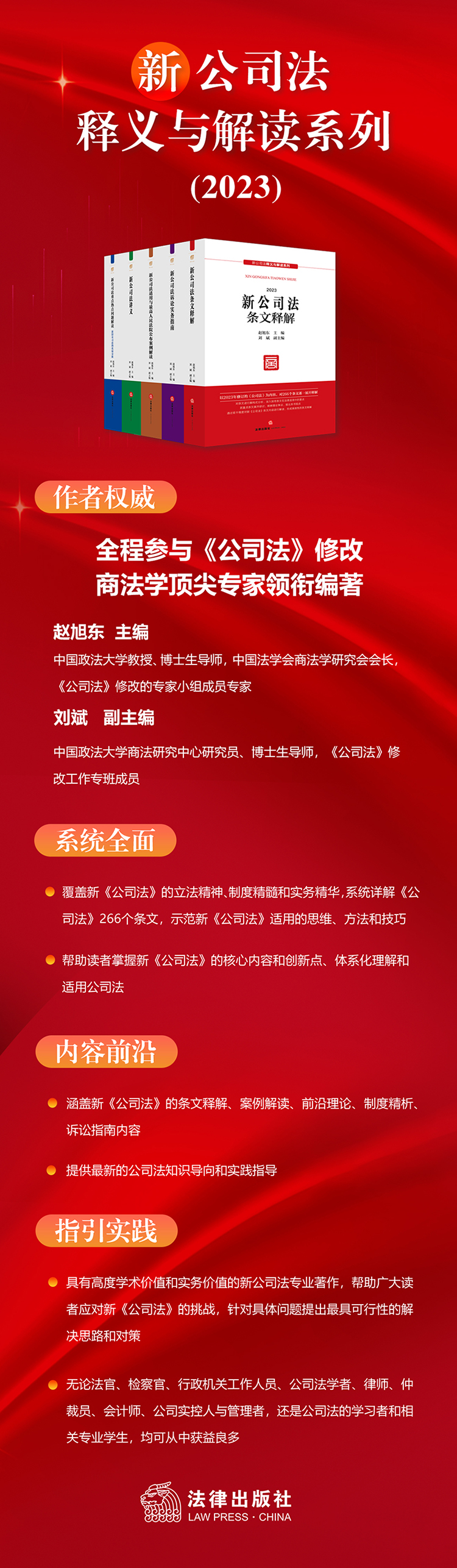 作者权威 本书由全国人大常委会法工委公司法修改专家小组成员赵旭东教授任主编、公司法修改工作专班成员刘斌副教授任副主编。 他们全程参与立法并对重要制度的修改完善进行了专项调研。 赵旭东,中国政法大学教授、博士生导师,中国法学会商法学研究会会长。 刘斌,中国政法大学商法研究中心研究员、博士生导师。 内容全面 《新公司法释义与解读系列(2023)》整体200余万字,涵盖法条释义、案例解读、诉讼实务指南、重点热点新旧对比分析、讲义,从立法到司法、从理论到实务全覆盖。