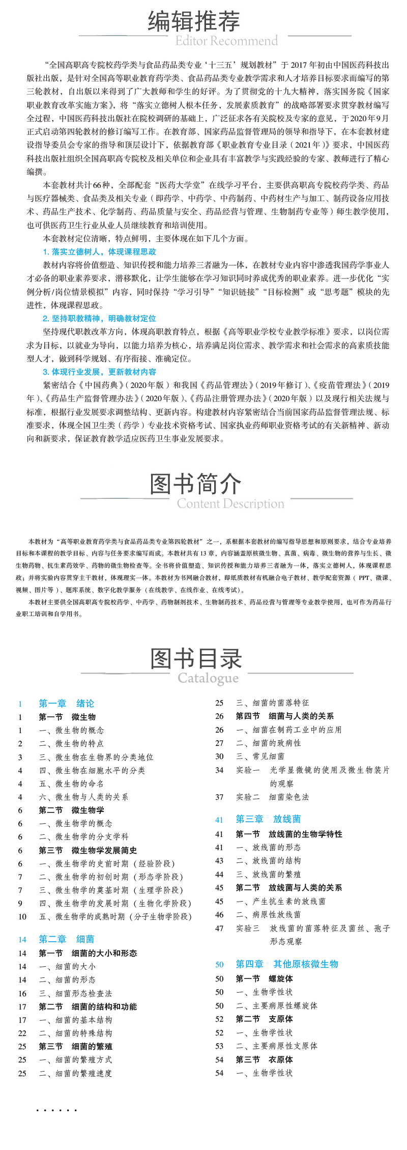 副主编张丽韩果红彭必武 编者(以姓氏笔画为序) 王翠(福建生物工程职业技术学院)王菲菲(天津生物工程职业技术学院) 王晨霞(金华职业技术学院)牛四坤(山西药科职业学院) 李璐(山东中医药高等专科学校)张丽(山东药品食品职业学院) 张珊珊(山东医药技师学院)陈明琪(中国药科大学) 武蕾(山东医学高等专科学校)范立嵩(山东药品食品职业学院) 罗翀(湖南食品药品职业学院)彭必武(湖南食品药品职业学院) 韩果红(中国药科大学)