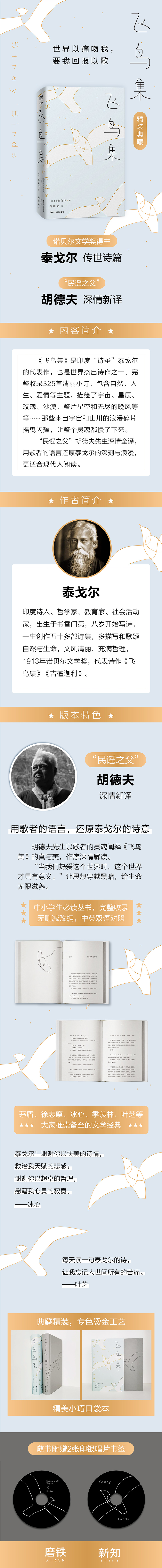 "●如果你因错过太阳而流泪,那么你也将错过群星。 ●白云谦逊地站在天边。晨曦以彩霞为它加冕。 ●那些无名岁月的感触,如青苔依恋着古树般,攀附上我的心头。 ●太阳只穿一件简洁的光衣,而白云却被装点得光彩夺目。 ●群山如一群喧嚷的孩子,举起双臂想去捉天上的星星。 ●土地里的树根不因树木丰饶的果实而要求回报。 ●让我这样设想,群星之中有一颗明星指引着我的人生,去通过不可知的黑暗。 ●夜晚偷偷地把花朵绽放了,却让白昼去领受感谢。 ●萤火虫对天上的星说道:“学者说你的光总有一天会熄灭的。” 天上的星不回答它。 ●思想掠过我的心上,如一群雁飞掠苍穹。我听见它们振翅之声了。 ●云把河的杯子斟满,自己却躲进远山。 ●蟋蟀的唧唧声、夜雨的淅沥声,从暗夜中传到我的耳边,好似我已逝的年少时代在沙沙声中来到我的梦境。 ● 白昼以这小小地球的喧扰,淹没了整个宇宙的沉默。 ●相聚时灯长明,别离时灯骤停。 ●让我做你的杯吧,让我为了你,与为了你的人而满溢吧。 ●你愿意时,就熄了灯吧。我将懂得你的黑暗并还爱着它。 ●我不央求你进到我的屋里。请走进我无尽的孤寂里来吧,我的爱人! ●我居住在自己的小小世界里,生怕它再缩小一丁点儿。把我抬举到您的世界里去吧,让我有乐于失去我的一切的自由。 ●让这作为我最后一句:“我相信你的爱。” 如同海鸥与海浪的相遇,我们相遇与亲近。海鸥飞走了,海浪也越卷越远,我们也就分开了。 ●上帝对人们说:“我要治愈你,所以要伤害你;我爱你,所以要惩罚你。” ●道路虽拥挤却依然寂寞,因它不是被爱着的。 ●全是理性逻辑的心,就像一柄全是锋刃的刀。它让使用它的人手上流血。 ●爱会失去的这个事实,乃是我们无法接受的一个真理。" "★诺贝尔文学奖得主泰戈尔传世之作,每一首都让你重新热爱世界 世界文学巨匠泰戈尔传世诗篇,关于自然、生命、爱的哲思,让你从中获得从容与坚定、浪漫与清醒。 ★“民谣之父”胡德夫深情新译,用歌者的语言,还原泰戈尔的诗意 胡德夫以歌者的灵魂阐释《飞鸟集》的真与美,作序深情解读,“当我们热爱这个世界时,这个世界才具有意义。” ★茅盾、徐志摩、冰心、季羡林、叶芝等大家推崇备至的文学经典 叶芝说:“每天读一句泰戈尔的诗,让我忘记人世间所有的苦痛。” 诗篇用短小的篇幅,治愈生活的焦虑与迷茫。 ★完整无删,中英双语对照,精美小巧口袋本 完整收录325首短诗,保留原诗韵味。中英对照,留白设计,轻巧便携。 ★烫金银工艺,精装典藏,随书附赠2张唱片书签 "