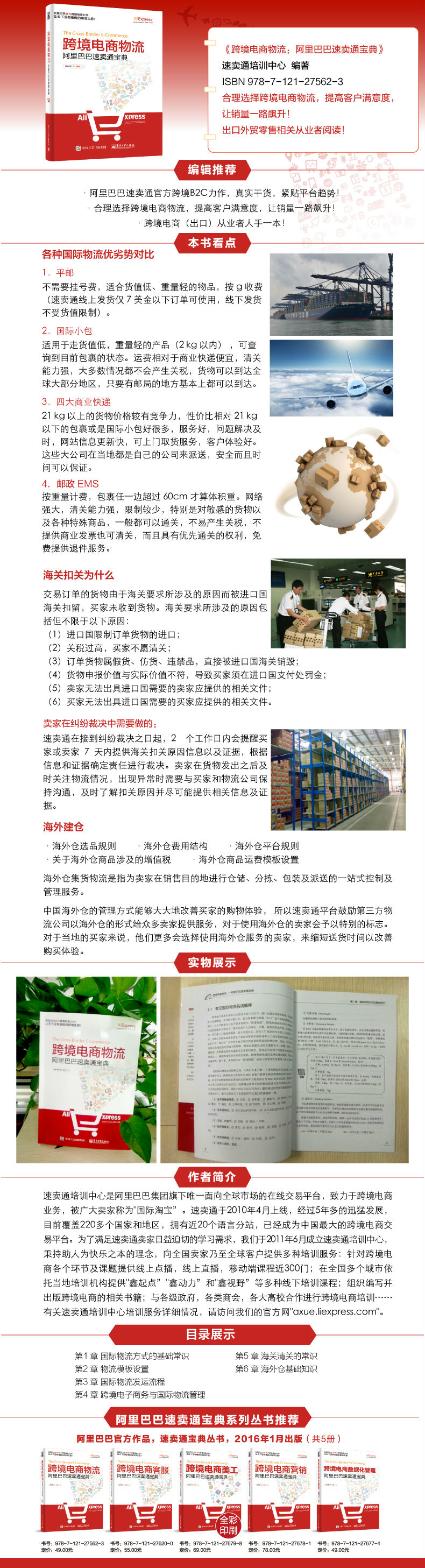 速卖通是阿里巴巴集团旗下唯一面向全球市场的在线交易平台,致力于跨境电商业务,被广大卖家称为“国际淘宝”。速卖通于2010年4月上线,经过5年多的迅猛发展,目前覆盖220多个国家和地区,拥有近20个语言分站,己经成为中国最大的跨境电商交易平台。 为了满足速卖通卖家日益迫切的学习需求,我们于2011年6月成立速卖通大学,秉持助人为快乐之本的理念,向全国卖家乃至全球客户提供多种培训服务:针对跨境电商各个环节及课题提供线上点播、线上直播、移动端课程近300门;在全国多个城市依托当地培训机构提供“鑫起点”“鑫动力”和“鑫视野”等多种线下培训课程;组织编写并出版跨境电商的相关书籍;与各级政府、各类商会、各大高校合作进行跨境电商培训. 有关速卖通大学培训服务的详细情况,请访问我们的官方网站“http://university.aliexpress.com/”,也可以扫描二维码直接进入。