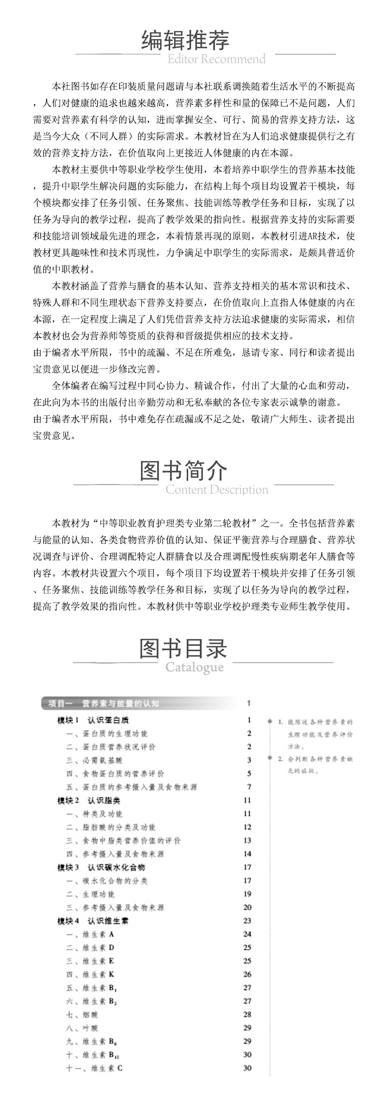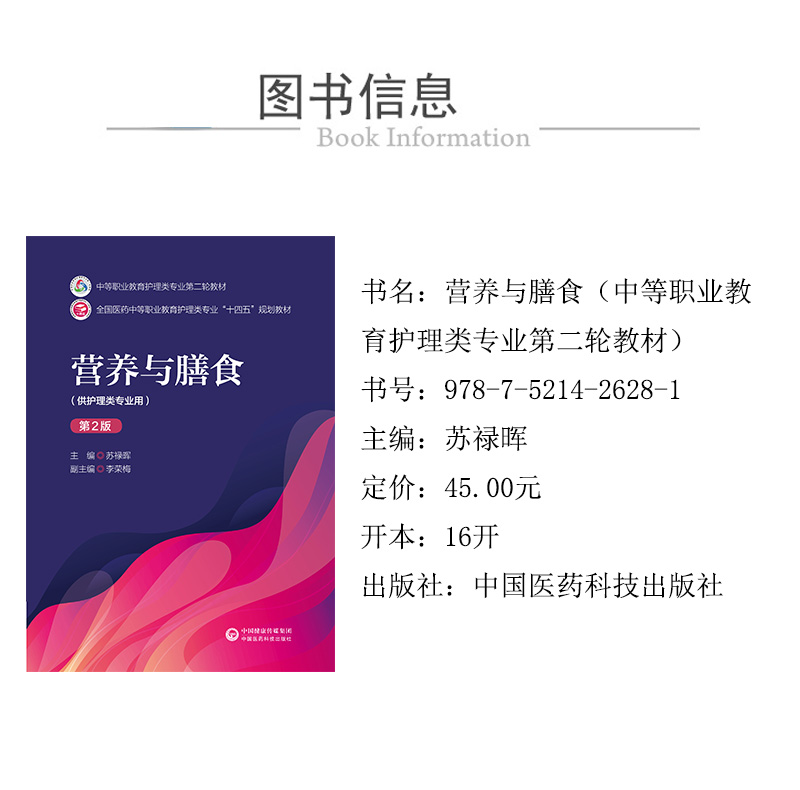 营养与膳食(第2版)[中等职业教育护理类专业第二轮教材] 出版时间 2022-02-01T00:00 其他类别 78127 作者: 编者:苏禄晖 出版社: 中国医药科技 原售价: 45.00 折扣价: 34.20 折扣购买: 营养与膳食(第2版)[中等职业教育护理类专业第二轮教材] ISBN: 9787521426281 作者简介 内容简介 上一篇:化工节能技术(国家示范性高职院校建设规划教材)下一篇:NoSQL数据库技术(高等院校计算机类规划教材)/数据科学与大数据技术专业教材丛书