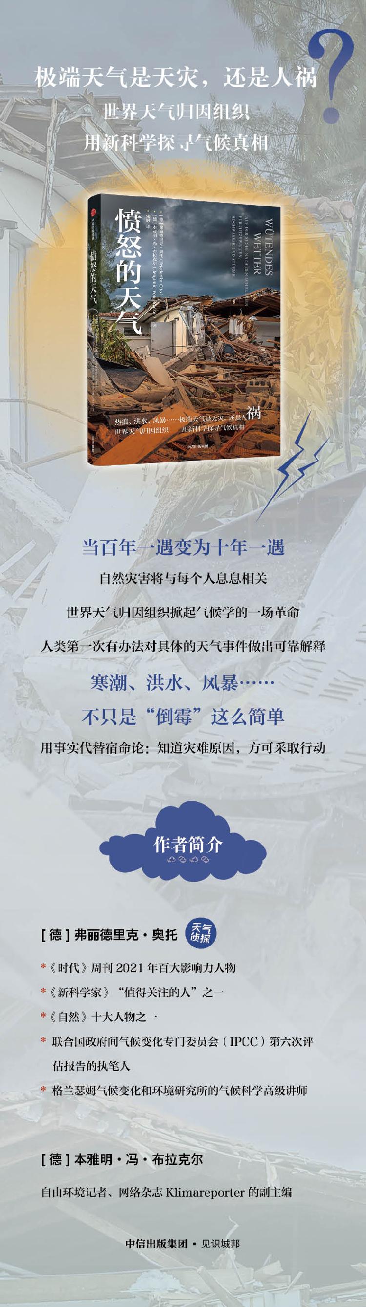 弗丽德里克·奥托,曾任牛津大学环境变化研究所主任,2021年10月进入帝国理工学院,现为格兰瑟姆气候变化和环境研究所的气候科学高级讲师,该研究所是英国帝国理工学院的六个研究、创新和影响全球挑战的中心之一。她学习物理学出身,2011年在柏林自由大学获得科学哲学博士学位。 奥托还是联合国政府间气候变化专门委员会(IPCC)第六次评估报告的执笔人之一,参与创立了事件归因科学这个新领域。2015 年,奥托帮助建立了世界天气归因(WWA)小组,旨在快速分析气候变化在暴雨、干旱和野火等异常活动中所起的作用。目前为止,奥托和 WWA 小组分析过法国的寒潮、发生在德国和比利时的灾难性洪水、加拿大和美国太平洋西北部的热浪等。未来,奥托将与瑞典隆德大学(Lund University)社会科学家艾米莉·博伊德(Emily Boyd)和法律学者一起,共同探索弱势群体和国家如何利用归因研究来应对气候变化。 2019年,奥托被评为《新科学家》的 "值得关注的人 "之一,2020年,气候变化归因被评为《麻省理工科技评论》十大突破性技术之一。2021年,她被《自然》选为十大人物之一,被称为“天气侦探”,同列人物榜的还有中国火星探测任务总设计师张荣桥。《时代》周刊也将她列入2021年百大影响力人物。奥托的工作被全球媒体广泛报道,包括《金融时报》《经济学人》《印度时报》《太阳报》《华尔街日报》《电讯报》《卫报》《纽约时报》《华盛顿邮报》《每日邮报》《时代周刊》《明镜》,以及BBC和CNN。;.;本雅明·冯·布拉克尔,毕业于慕尼黑德国新闻学院,作为自由环境记者为《南德意志报》和《法兰克福汇报》等媒体撰稿。他是网络杂志《气候报道》(Klimareporter)的副主编。 本雅明·冯·布拉克尔,著名环境记者,常驻柏林,为《南德意志报》和《法兰克福汇报》等媒体撰稿。他是在线杂志Klimareporter°的副主编。