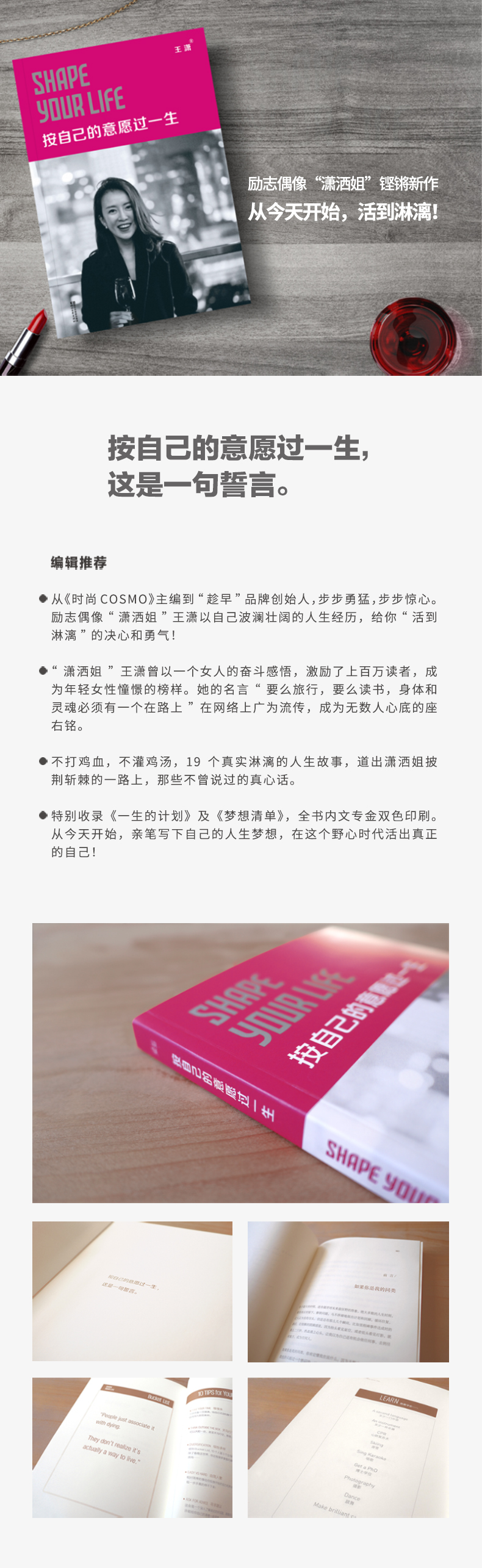 我有个表姐,是我姨的女儿,天蝎座,比我大整 整十一岁。十一岁基本就是一整轮的时代差距,意味 着我刚上中学,她已完成大学毕业工作结婚等一系列 标准动作。按说这个差距在表姐妹间不构成影响,但 她不一样,她是学霸!每个亲戚团体中总会有那么一 个学霸负责成为集体励志样本,在我家则非她莫属。 每逢年中年尾,永远传来她令人绝望的考试捷报,让 爸妈第一时间用来鞭策我勇猛精进。好在年龄差距实 在过大,等我上初中,她已硕士毕业成为大学老师, 终于让我从家族榜样的阴影中暂时解脱出来。 表姐自己是学霸,还嫁了一个超级学霸,我姐夫 。 我姐夫不是一般人,他是当年浙江地区的高考状 元,然后保送读硕读博。博士毕业后,他进入中国科 学院工作,据说工作内容是国家机密,我只知道他研 究载人航天飞机,属于科学家。关于航天飞机,我的 科学家姐夫只透露过一句——早在1996年,他就告诉 我中国宇航员已经在训练了,说我这一代,如果想上 天,还是有希望的。 高中一年级文理科分班后,我姐夫开始帮我补习 数学。为了补习效果好,我爸整个暑假都安排我住在 学霸夫妇家。如果说一个人的思维方式存在改变锚点 的话,那么我的锚点就在1995年的夏天。 那个暑假异常漫长,我为了学习.寄居在学霸夫 妇家,同时必须适应他们的生活方式。学霸夫妇早起 第一件事是播放教学录像带《走遍美国》,在播放的 同时完成洗漱早饭等准备活动。说早饭是准备活动, 是因为在早饭后,他们一定会关闭电视,各自拿出一 个记事本安静读写十分钟,再开始一天的工作生活。 一天结束后,偶尔会在楼下打一会儿羽毛球.晚饭时 则需再次温习早上看过的《走遍美国》,饭后立刻关 闭录像,两人各自关进一个房间内长达三小时。这三 小时严格计时、雷打不动。每晚,整个家中无声无息 ,堪比图书馆或者大学自习室,彻底隔绝了外部世界 。几天之后,我就快疯了。 我表姐当时是大学老师,大部分时间与我一样放 假,为我编排了和她一致的生活日程;而我的学习计 划,则由我姐夫制定。制定那天,我看见我学了一年 都没弄通的数学书,被我姐夫三分钟翻完,合上书他 问我:“大学你想上哪儿?” “啊?”我呆住,我心说我当然想上清华北大, 我也得能考上啊。 “你有特别喜欢的行业吗?”他又问。 除了我爸我妈我表姐姐夫,我根本就没见过这世 界上都有什么行业,更谈不上喜欢了。只好说:“不 知道啊。”但又觉得这个回答太弱智,赶紧补充:“ 我喜欢好看的行业。” “好看?好看的行业是什么行业?” 我支支吾吾说不出来。 我姐夫只好继续启发我:“你就这么想,你认识 的人里,谁的生活你最想过,你未来想成为谁那样的 人;还有,你最喜欢干什么看什么。综合起来画一个 交集,看这里是不是存在你喜欢的行业。” P10-11 ●?潇洒姐王潇代表作,畅销40万册修订版,新增2万字故事 ●?怎样《按自己的意愿过一生》?励志偶像“潇洒姐”王潇以自己波澜壮阔的人生经历,给你“活到淋漓”的决心和勇气! ●?从《时尚COSMO》主编到“趁早”品牌创始人,步步勇猛,步步惊心。继畅销作品《女人明白要趁早》后,王潇首度披露在成长、创业、情感历程中的笑与泪。 ●?不打鸡血,不灌鸡汤,25个真实淋漓的人生故事,道出潇洒姐披荆斩棘的一路上,那些从未说过的真心话。