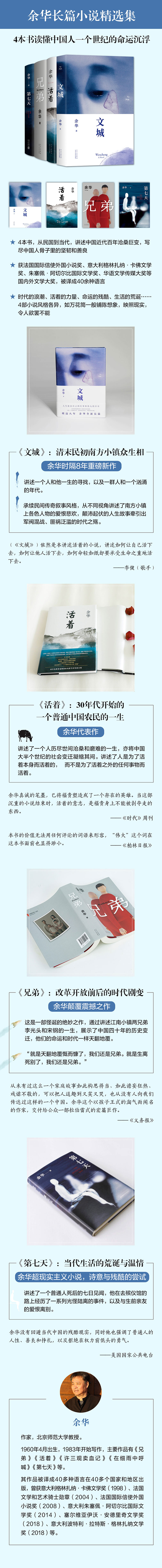 余华四部小说讲述中国近代百年沧桑巨变,写尽中国人骨子里的坚韧和善良! 《文城》:余华时隔8年重磅新作;清末民初南方小镇众生相 《活着》:余华的代表作;30年代开始的一个普通中国农民的一生 《兄弟》:余华巅·峰之作;当代中国四十年时代剧变 《第七天》:余华超现实主义小说,诗意与残酷的尝试;当代中国人生活的荒诞与温情 -国民作家余华长篇小说精选,好读的文学,好看的故事,感受余华叙述的魔力 -获法国国际信使外国小说奖、意大利格林扎纳·卡佛文学奖、朱塞佩·阿切尔比国际文学奖、华语文学传媒大奖等文学大奖,被译成40余种语言 -余华以悲欢交集的笔触与无所畏惧的叙述,展现了普通人的生活是如何被打破,又如何得到重建 的。——《出版商周刊》