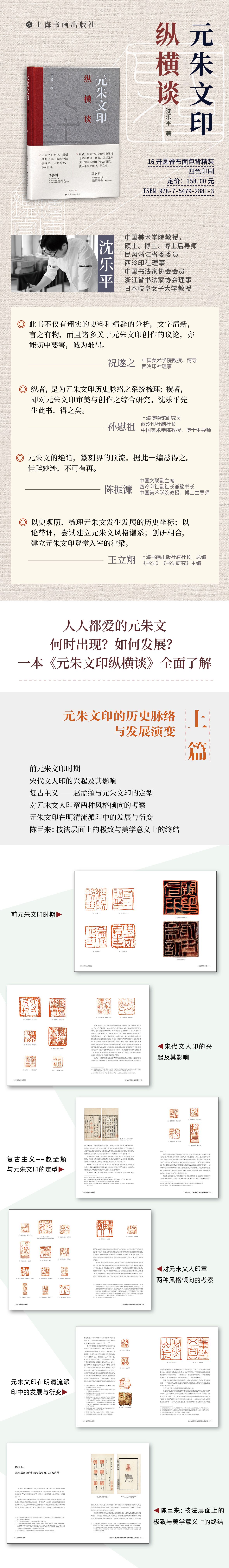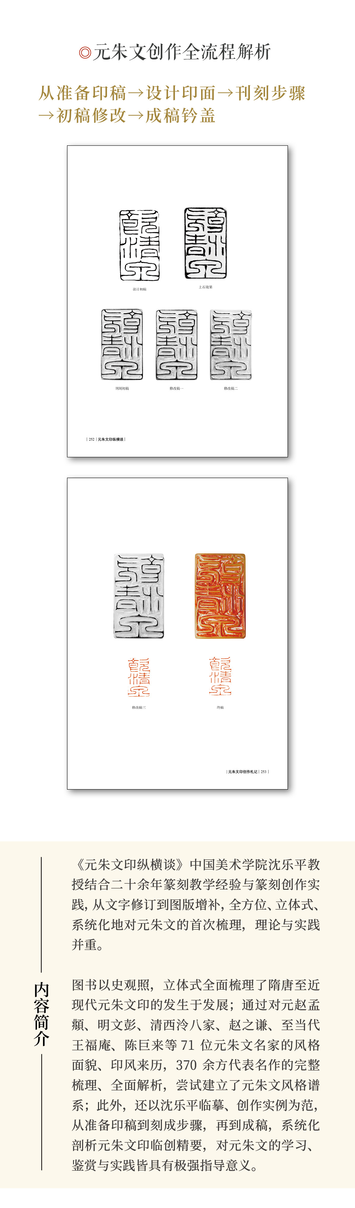 ●实用性强 拥有二十余年篆刻教学经验与篆刻创作实践的中国美术学院教授沈乐平,首次全方位、立体化、系统性梳理元朱文印理论与实践,印论文献资料详实、权威、丰富,全面阐释元朱文的发生发展、审美欣赏和创作实践,对元朱文研究、欣赏、临摹创作者极为实用。 ●性价比高 图书售价仅为已经绝版之32开《元朱文印论谈》孔网绝版旧书一半,13年图文全面完整修订,16开全彩呈现,大量文献、篆刻印稿及实物新资料增补 1. 进一步详实、丰富第一版中的文献资料。 2.增加元朱文代表作实物印面 48 例,更能清晰直观阅读原作细节。 3.增加近年刊布元朱文印的实物图片与史料知识270余条。 4.增加沈乐平元朱文代表作 60 例,附每方印创作手记。 5.增加创作实例,从准备印稿到刻成步骤,并配有实物图版和每一步骤的印稿。 6.增加部分印鉴所在原书法作品图版。