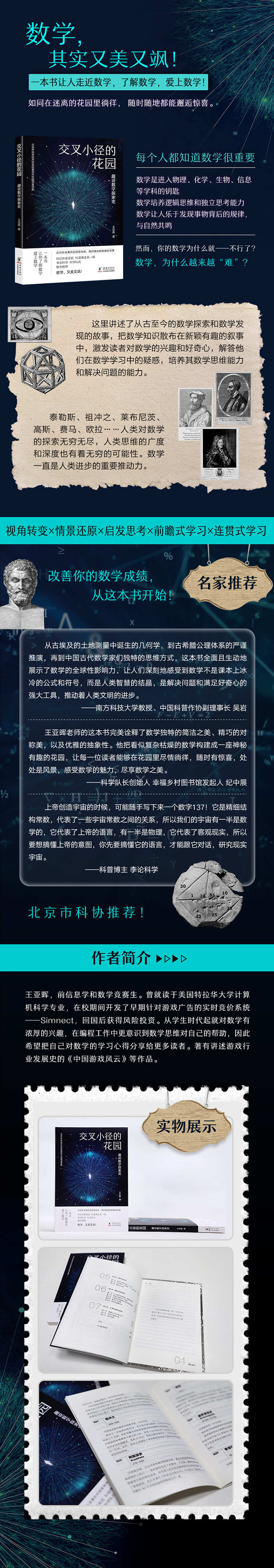 1.从古埃及的土地测量中诞生的几何学,到古希腊公理体系的严谨推演,再到中国古代数学家们独特的思维方式,这本书全面且生动地展示了数学的全球性影响力,让人们深刻地感受到数学不仅仅是课本上冰冷的公式和符号,而是人类智慧的结晶,是解决问题和满足好奇心的强大工具,推动着人类文明的进步。 ——南方科技大学教授、中国科普作协副理事长 吴岩 2.王亚晖老师的这本书完美的诠释了数学独特的简洁之美、精巧的对称美,以及优雅的抽象性。他把看似复杂枯燥的数学构建成一座神秘有趣的花园,让每一位读者能够在花园里尽情的徜徉,随时有惊喜,处处是风景,感受数学的魅力,尽享数学之美。 ——科学队长创始人 幸福乡村图书馆发起人 纪中展 3.上帝创造宇宙的时候,可能随手写下来一个数字137!它是精细结构常数,代表了一些宇宙常数之间的关系,所以我们的宇宙有一半是数学的,它代表了上帝的语言,有一半是物理,它代表了客观现实,所以要想搞懂上帝的意图,你先要搞懂它的语言,才能跟它对话,研究现实宇宙。 ——科普博主 李论科学 4.一本几乎没有公式和方程的数学书,带你穿越回千百年前,与世界上最聪明的大脑们一起探索数学的世界。 ——朱一明老师