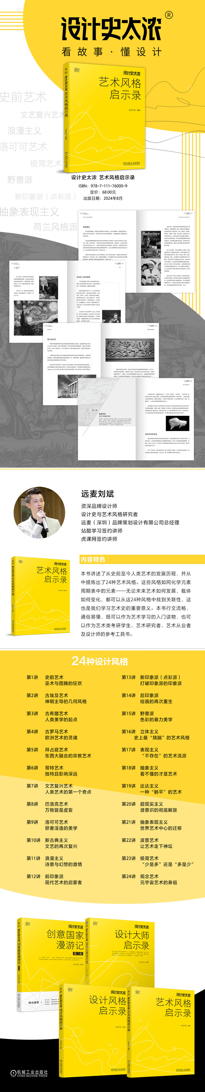 设计史太浓 出版时间 2024-08-01T00:00 其他类别 80798 作者: 远麦刘斌编著 出版社: 机械工业 原售价: 68.00 折扣价: 46.30 折扣购买: 设计史太浓 ISBN: 9787111760009 作者简介 远麦刘斌 资深品牌设计师 设计史与艺术风格研究者 远麦(深圳)品牌策划设计有限公司总经理 站酷学习签约讲师 虎课网签约讲师 内容简介 远麦刘斌“设计史太浓”图书系列。 系统讲述了从史前至今人类艺术的发展历程的24种艺术风格。 行文流畅,通俗易懂,既可以作为艺术学习的入门读物,也可以作为艺术类考研学生、艺术研究者、艺术从业者及设计师的参考工具书。 上一篇:建设行业试验员岗位考核培训教材(第2版)下一篇:天然药物化学实验指导(供药学类专业用第4版全国高等学校药学类专业第八轮规划教材配套教材)