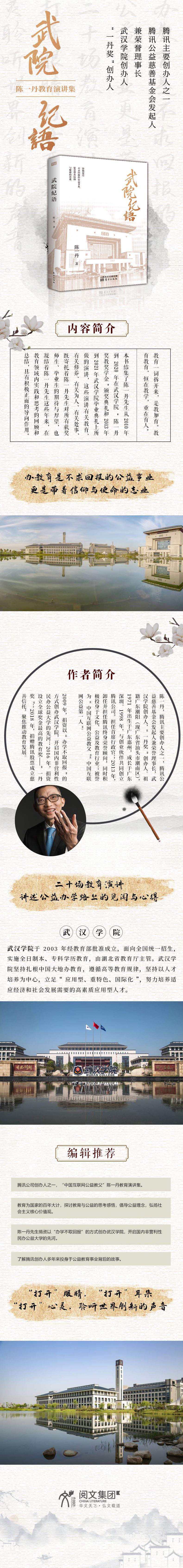 腾讯主要创办人之一,腾讯公益慈善基金会发起人兼荣誉理事长,武汉学院创办人,“一丹奖”创办人 陈一丹教育演讲集 中国互联网公益教父 中国互联网公益第一人 办教育是不求回报的公益事业,更是带着信仰与使命的志业。 二十场教育演讲,讲述公益办学路上的见闻与心得。 “打开”眼睛,“打开”耳朵,“打开”心灵,聆听世界创新的声音。