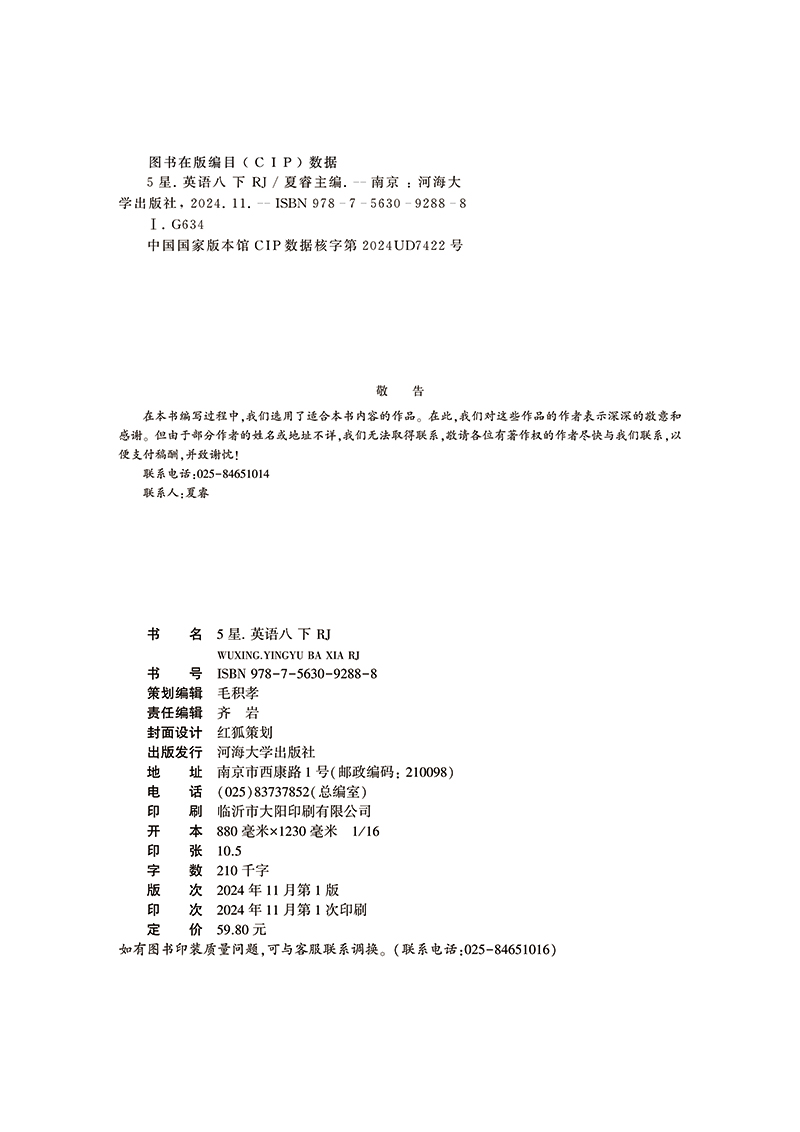 25春 初中5星学霸 英语 八下 人教 出版时间 2024-11-01T00:00 英语 7272 作者: 夏睿 出版社: 河海大学 原售价: 59.80 折扣价: 36.60 折扣购买: 25春 初中5星学霸 英语 八下 人教 ISBN: 9787563092888 作者简介 内容简介 上一篇:初中必刷题 英语八年级上册 RJ下一篇:高中英语(必修4人教版)/同学教材分层讲练