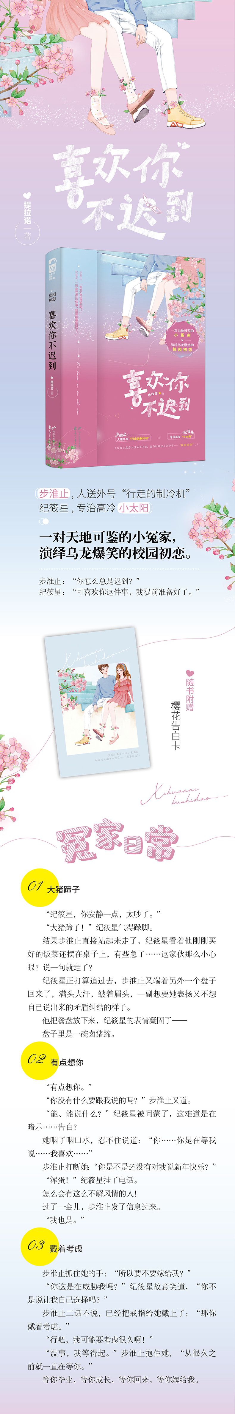 楔子 纪筱星被赶出教室的时候,只有平时的“难兄难弟”顾洋抬起头,给了她一个“壮士走好”的眼神,于是她咬咬牙,背着书包走出了校门。 高三了,任何会让班主任梁文静头疼的“恶行”都会被狠狠扼杀。比如纪筱星这样上课倒腾录音机、还发出了奇怪的声音的学生,当然立刻就被当作顽劣分子赶走了。 录音机不是纪筱星的,她只是帮忙修一下而已,没想到总算让录音机发出了“吱吱”的响声,梁文静就站在她身后,气得要没收。 毕竟今天是星期一,想到班主任可能有“星期一综合征”,这班主任梁文静还是一个长相凶悍的年轻女孩,要是赶上“特殊时期”比较敏感,那不就更加惨了? 纪筱星本来想要服软,但是转念一想,谁没有“星期一综合征”呢? 而且最关键的是,录音机当然不能被没收,纪筱星跟老师顶了两句嘴,英勇无比地收拾书包走人。 纪筱星漫无目的地在街头走着,这个时候街上的人不多,她从口袋里掏出钱买了一杯奶茶,来到了A大的新校区。 这里有回老校区的公交车,快捷直达。 毕竟是起点站,上了车之后,纪筱星找了一个靠窗的位置坐下。 来往两个校区的公交车一般都会尽量等到人满了才离开,纪筱星喝着奶茶,看着窗外的风景,从包里拿出了手机看了一眼,这部破旧的小手机上,只有老爸的一条信息: “小星啊,赶紧回来,我有话跟你说。” 果然,梁文静怎么会放过这样一个告状的机会? 纪筱星叹了口气,靠着椅子打算睡一觉。 老校区在郊外,路上至少得花一两个小时。 不知不觉中,车子缓缓开动了。 纪筱星迷迷糊糊之中感觉得到,车上的学生越来越多,她坐的座位刚好是侧着的一个横排,有人站在自己面前,而且离自己还很近。 车子晃悠着,纪筱星睡得更加深沉,结果车忽然刹住,她的手一抖,奶茶从手里掉落。 “哗啦啦”一声,身边不知道是谁倒吸了一口凉气。 纪筱星一下子惊醒过来,看到了面前一张难看得如同吃了只苍蝇般的脸。 可是这样的表情并不影响这张脸的主人出众的外貌,五官宛如雕刻般完美,星目剑眉,目光深邃,低垂的眸子带着一丝微微的震怒和寒意。本来男生就生得清冷,让人难以接近,但是眼角的泪痣平添了一种柔情,看着矛盾又相得益彰。 不过眼下不是她欣赏对方这盛世美颜的时刻,因为她手里的奶茶没喝完,全部泼到了他的脚上,白色的球鞋全部没能幸免沾染上了奶茶,几颗“珍珠”还顽皮地卡在了鞋带和鞋子的缝隙之中。 完了,纪筱星条件反射般要站起来,没想到车子又重新开了,她身子趔趄向前一冲,头顶直接撞上了男生的脸,耳边他痛苦的“啊”声清晰可闻。 这一撞,纪筱星又重新坐下了。 那个自顾自开着车的司机或许压根儿没有想到,自己不经意在路上遇到的一个小坑,让车子轻轻地颠簸了一下,会让后排站在纪筱星面前的这个男生,因为被撞到了鼻子而吃痛,手便下意识地松开了扶手,捂着自己的鼻子。 男生怎么也不会想到,因为自己没有扶着栏杆,在这个颠簸过程中,他会身体向前倾,然后直接向着纪筱星就扑过去了。 于是在两个人,一个抬头一个往下扑的瞬间…… 男生的嘴唇轻轻地印在了纪筱星的额头上。 如同许下誓言一般,留下了这样的印记。 围观群众脸色各异,尤其是男生身边的女生,脸色差得已经不是吃了一只苍蝇,而是像在吃一群苍蝇。 本来以为自己今天已经够倒霉的纪筱星,忽然在这一瞬间觉得,自己虽然是被亲的那一个,但是谁更倒霉,好像还真的说不上来。 然后纪筱星知道了男生的名字。 男生身边的女生惊恐地大叫着:“淮止!你!赶快移开你的头!” 纪筱星真是很委屈,因为女生口中的“你”肯定是指的她,可是她的头不好移开,男生的嘴倒是很好移开啊! 不过纪筱星终于意识到了一件更为重要的事情…… 啊,原来他就是那个传说中的步淮止啊。 第一章 完美的倒霉蛋 纪筱星不是A大的学生,她只是一名普通的高三在读少女。因为老爸在A大开了个维修小铺,就在学校旁边租了个屋子,纪筱星平时也都是来A大的食堂解决三餐,对这里是了如指掌。 她会知道步淮止这个风靡全校的优质校草,完全是因为他已经声名在外,大学里几乎无人不知无人不晓——学生会会长,家境优渥,在学校里极受欢迎。 平时来店里的小姐姐们都会兴奋又花痴地议论几句。 所以纪筱星虽然没见过步淮止,但是也对这个名字早有耳闻。 当然,在发生了如此尴尬的“会面”之后,步淮止已经被之前尖叫的女生扶到了车子后方。 车上依旧拥挤,隔着那么多人也不知道步淮止怎么样了,周围的人都在看着纪筱星议论纷纷。纪筱星拿出耳机戴上,用自己那部残破不堪的手机放着音乐,打算继续睡下去。 不就是因为撞着才亲了一下额头吗?都什么年代了,挤地铁还有脸贴脸的呢。 纪筱星什么大世面没见过,比如顾洋就整天在学校里逗小学妹,不是勾肩搭背就是拉拉小手。之前学校艺术节结束,班上几个同学出去吃饭庆祝,玩起国王游戏那叫一个大胆。 只是被人亲了额头,“肇事者”和“受害者”都没事,反倒是看热闹的似乎大为不满。纪筱星懒得搭理,无心理会,眼睛一闭,往椅背上一靠。 高三以来她就没有睡过一个好觉。 车子到站,纪筱星是被司机给推醒的。 她迷迷糊糊地睁眼,发现车子已经空了。 纪筱星赶紧用手抹抹嘴边的口水,急忙下了车,往老爸的店跑过去。 可是走到门口,她又有些却步。 应该怎么跟老爸开口呢? 还没有想好,纪淳从店里走出来,正