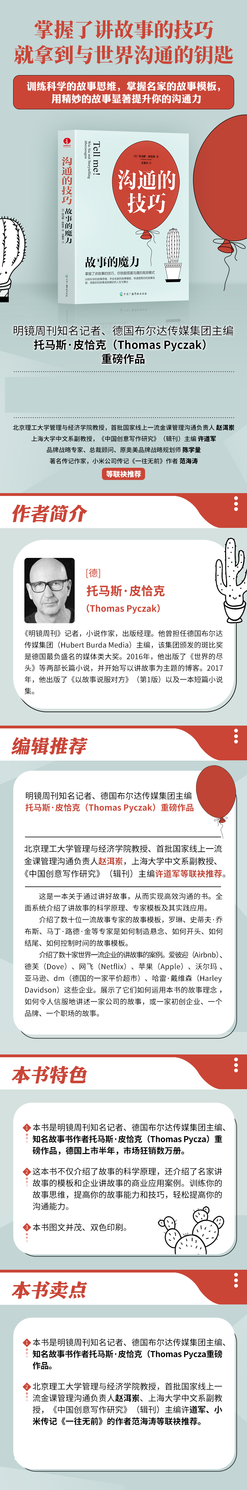 明镜周刊知名记者、德国布尔达传媒集团主编托马斯·皮恰克(Thomas Pyczak)重磅作品 德国上市半年,市场狂销数万册。 北京理工大学管理与经济学院教授、首批国家线上一流金课管理沟通负责人赵洱岽,上海大学中文系副教授、《中国创意写作研究》(辑刊)主编许道军等联袂推荐。 这是一本关于通过讲好故事,从而实现高效沟通的书。全面系统介绍了讲故事的科学原理、专家模板及其实践应用。 介绍了数十位一流故事专家的故事模板,罗琳、史蒂夫·乔布斯、马丁·路德·金等专家是如何制造悬念、如何开头、如何结尾、如何控制时间的故事模板。 介绍了数十家世界一流企业的讲故事的案例。爱彼迎(Airbnb)、德芙(Dove)、网飞(Netflix)、苹果(Apple)、沃尔玛、亚马逊、dm(德国的一家平价超市)、哈雷·戴维森(Harley Davidson)这些企业。展示了它们如何运用本书的故事理念,如何令人信服地讲述一家公司的故事,或一家初创企业、一个品牌、一个职场的故事。