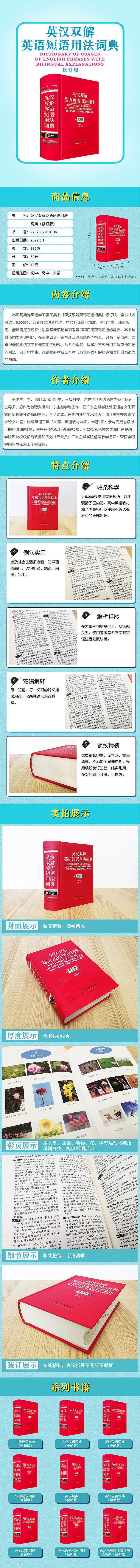 本部词典为《英汉双解英语短语用法词典》修订版。在原版本基础上,作者与时俱进更新了部分例句,增加了短语链接,使得新版《英汉双解英语短语用法词典》实用性更强,对于英语爱好者、英语教学者及英语使用者具有很好的参考价值。