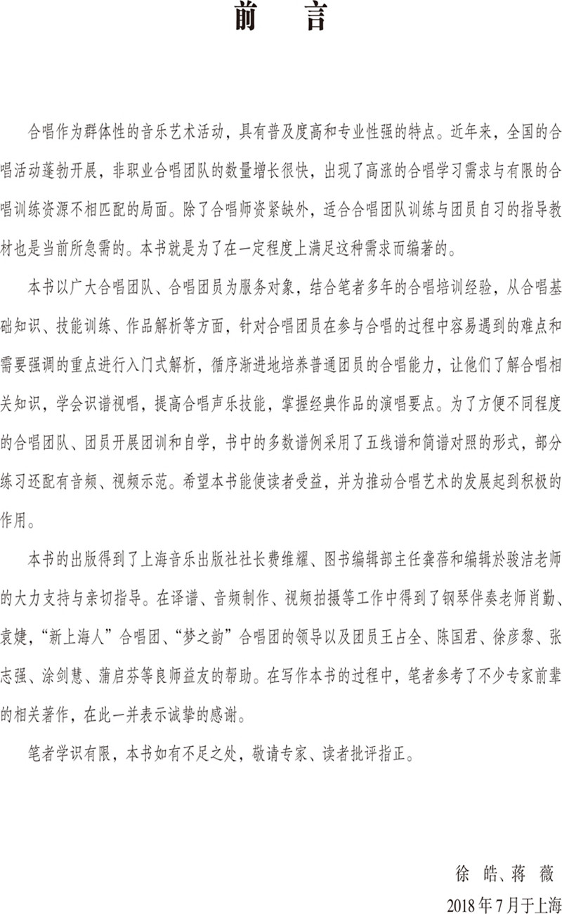徐皓,1982年10月1日生于上海,上海市群众艺术馆培训部副主任、副研究馆员,上海音乐家协会合唱专业委员会宣传部部长助理、理事。近年来主要从事上海市基层文化人才队伍培训、合唱团队辅导等工作,有较丰富的社区合唱辅导和培训经验。所辅导的社区合唱团队曾获国家、省级各类奖项8项。2009年,策划并参与编辑《社区艺术指导》教材,个人撰写的9篇论文分别在《基础教育研究》《大众文艺》《东方教育时报》《群文SJ》等省级以上期刊、报纸上发表,其中两篇获Q国论文二、三等奖。 蒋薇,上海市非物质文化遗产保护中心副研究馆员。 自幼学习竹笛、萧等乐器,毕业于上海师范大学音乐学院课程与教学论专业,获硕士学位。 工作以来,与人合撰出版《江南丝竹》、《江南丝竹传承与发展》、《琵琶艺术》等6部非物质文化遗产专著,在国家核心期刊和省市期刊上发表论文26篇。 创作并演奏竹笛独奏曲《补天》、丝竹新作《云卷云舒》等,获上海市群众文化YX作品奖、上海市总工会文艺作品展评YX奖、“上海之春”YX新人新作奖等。 曾参加2008年北京奥运会、2010年上海世博会等重大文化活动,担任上海音协民管会团体会员单位考评、市教委“我是非遗小传人”等多项活动的评委。 受单位委派,牵头组建了专业、年轻的上海江南丝竹乐团,2017年年内20场重要演出均广受好评,《新民晚报》《看看新闻》等多家媒体发专文报道。