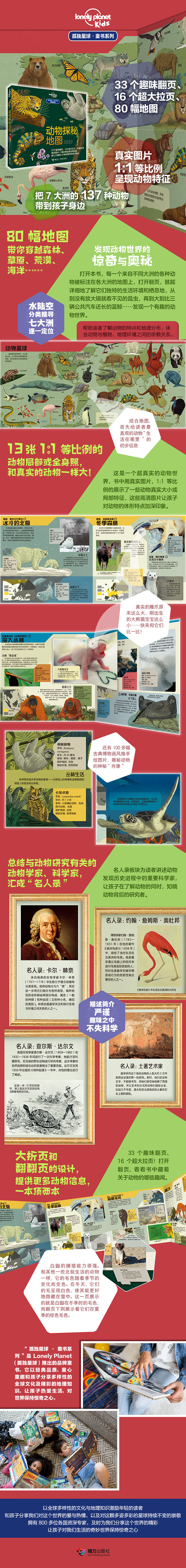 ★被誉为“旅行宝典”的孤独星球推出的品牌童书 ★33个趣味翻页、16个超大拉页、80幅地图,真实图片1:1等比例呈现动物特征,把7大洲的137种动物带到孩子身边 ★大开本、大拉页、翻翻页、实景照片、趣味手绘图、真实尺寸的动物图片……多种生动的展现方式,让动物迷们一次看个够 ★名人录板块讲述动物发现历史中的重要科学家,让孩子在了解动物的同时,了解动物背后的研究者 ★多种讲述方式、多样阅读体验,多角度的展示动物各个侧面的信息,描绘了真实的动物生活图景,帮助动物迷构建关于动物的完整知识体系,纠正和弥补动物认识的误区 ★1:1比例大小的动物图片,生动展示动物的真实大小,哇,食蚁兽的舌头这么长、刚出生的大熊猫宝宝这么小,快来和它们比一比! ★理解动物与自然和谐共处的奥秘,唤醒对动物世界的敬畏与热