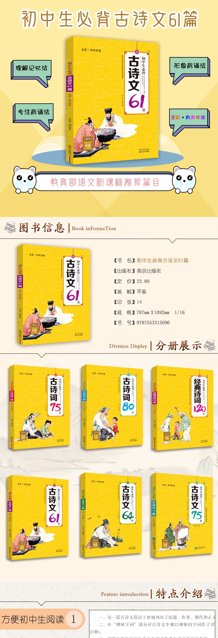 初中生必背古诗文61篇(全彩有声伴读) 出版时间 2016-10-01T00:00 文言文/古诗词 22121 作者: 编者:郑长青 出版社: 南京 原售价: 22.80 折扣价: 12.54 折扣购买: 初中生必背古诗文61篇(全彩有声伴读) ISBN: 9787553315096 作者简介 内容简介 上一篇:经典诗词每日一诵(4)/语文素养分级培育系列下一篇:宋词三百首(注音美绘版)/小学生新课标必读经典文库