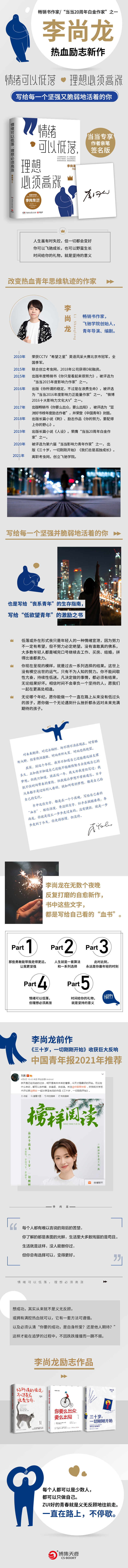 1.李尚龙励志新作,改变热血青年思维轨迹的激励之书: 每个人都可以是少数人,都可以只做自己。ZUI好的青春就是义无反顾地往前走。一直在路上,不停歇。这世界许多美好的事情,都源于坚持。坚持在时间的推动下,会有惊人的力量,这种力量能潜移默化地改变人。 2.这本书献给每一个坚强并脆弱地活着的你: 每个人都有难以言说的背后的苦楚,你了解的都是表面的光鲜,生活里大多数残留的是苟且。生活就是这样,没人能替你过,但你总有选择,可以变得更好。有些人就是必须在路上,因为只有在路上,才不会迷失。 3.当下的生活能通往你想要的未来吗?人生就是一套算法和一系列选择。 想成功,其实从来就不是义无反顾,或拥有满腔热血就可以;它有一套方法可遵循,以及必须认清“你要的成功,是自身所爱?还是他人期待?”,这样才能在追梦的过程中,不因跌跌撞撞而一蹶不振。怀有理想,一直在路上。 每个部分的后一节特别收录李尚龙的人生箴言,与你共勉。