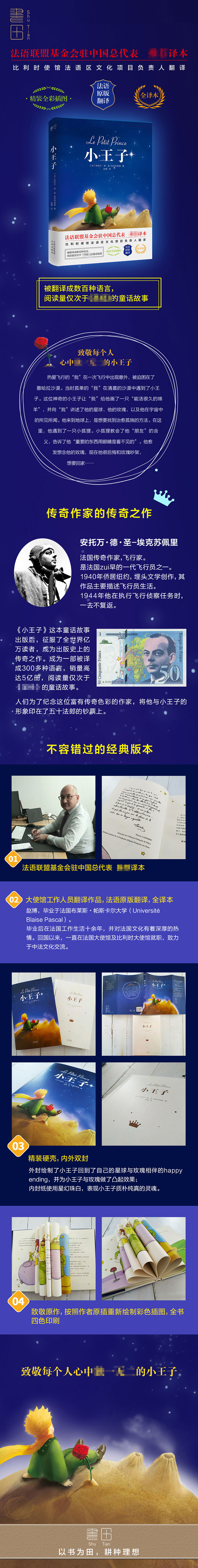 小王子(精) 出版时间 2019-12-01T00:00 名家名作 64842 作者: (法)安托万·德·圣-埃克苏佩里|责编:林勇|译者:赵博 出版社: 中国对外翻译 原售价: 39.80 折扣价: 0.00 折扣购买: 小王子(精) ISBN: 9787500160809 作者简介 安万·德·圣-埃克苏佩里 法国传奇作家,飞行家。 生于法国里昂市,是法国最早的一代飞行员之一。 1940年侨居纽约,埋头文学创作,其作品主要描述飞行员生活。 1944年他在执行飞行侦察任务时,一去不复返。 《小王子》这本童话故事出版后,征服了全世界亿万读者,成为出版史上的传奇之作。之后,人们为了纪念这位富有传奇色彩的作家,将他与小王子的形象印在了五十法郎的钞票上。 内容简介 上一篇:三岔河/走向世界的中国作家下一篇:西游记(精)/中国文学四大名著