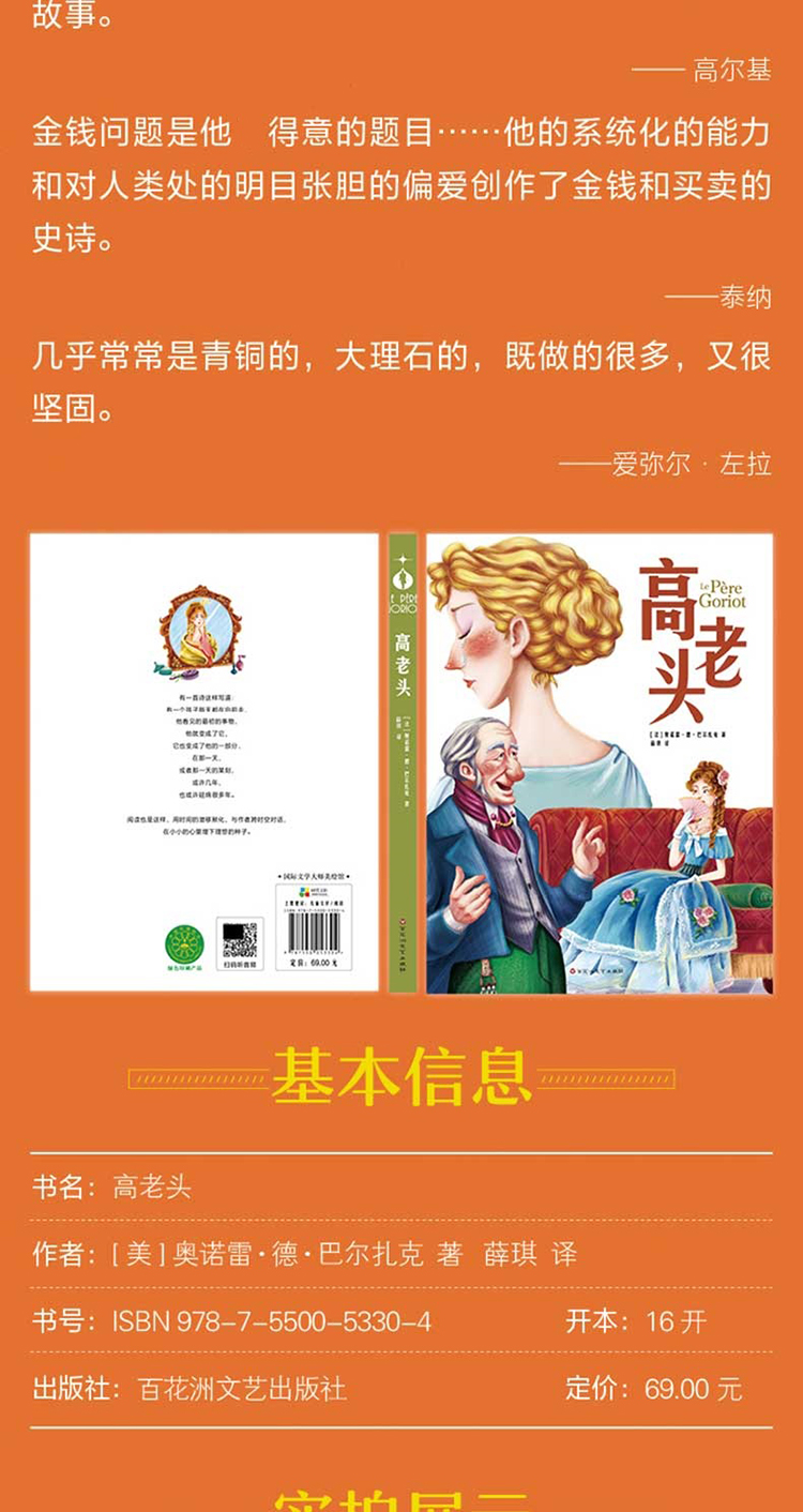 ★《高老头》描写了建立在金钱基础上的父爱和亲情,父爱和亲情与金钱息息相关。 ★在巴尔扎克的杰作《高老头》中,他以独特的笔触揭示了19世纪初法国社会的诸多真相。 ★巴尔扎克通过《高老头》这部小说,不仅揭示了当时社会的种种弊病,也深入探讨了人性的复杂性。 ★人生的真相在于洞悉金钱和情感的复杂、认清社会的现实之后,学会关注内心的真实需求,并且要勇于面对生活的真相。 ★《高老头》这部小说不仅是对父爱的赞美,更是对人性、金钱和社会现象的深刻剖析。 ★在这个充满诱惑与困境的世界里,《高老头》为我们提供了一面镜子,让我们看到了自己的不足,也看到了自己的可能性。