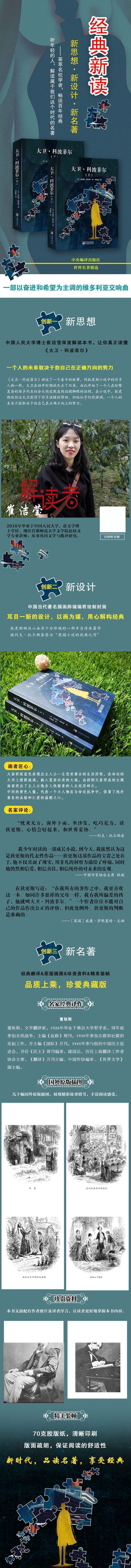 第一章我生下来了 在我自己的传记中,做主角的究竟是我自己呢,还是 别的什么人呢,本书应当加以表明。我的传记应当从我的 生活开端说起,我记得(据我听说,也相信),我生在一个 星期五的夜间十二点钟。据说。钟开始敲,我也开始哭, 两者同时。 考虑到我下生的日子和时辰,保姆和邻居一些识多见 广的太太们说(她们在无从与我会面的几个月前就聚精会神 地注意我了),第一,我是注定一生不幸的;第二,我有眼 能见鬼的特禀:她们相信,这两种天赋是与星期五夜半后 一两点钟内降生的一切不幸的男女婴儿分不开的。 关于第一点,我用不着在这里说什么,因为那预言结 果是被证实了呢,还是否定了呢,没有比我的经历更能表 明的了。关于本问题的第二项,我只能说,要不是我早在 婴儿时期就已丢光那一份遗产,那就是我还不曾承受到呢 。但是我若被夺去这份财产,我一点也不怨恨;假如任何 别人正在享受它,我衷心欢迎他加以保有。 我带着一层胎膜降生,这一张胎膜,以十五基尼⑦的 低价,在报纸上登广告出卖。是那时航海的人们缺少钱呢 ,还是缺少信仰而宁愿穿软木衫呢,我不知道;我只知道 ,一个与证券经纪业有关的辩护士递过唯一的价:两镑现 款,余数用葡萄酒补足,宁愿放弃不沉水的保证,也不肯 加一点价。结果广告撤回,广告费完全损失了——谈到箭 萄酒,我那可怜可爱的母亲自己那时也有葡萄酒出卖呢— —十年以后,那个胎膜由当地五十个人抽彩,每人出半克 朗,抽中的人出五先令。我自己也在场,像那样处置我自 己身体的一部分,我记得,我觉得很不安,很难堪。我记 得,那个胎膜由一个带提篮的老太太抽到手,她很勉强地 从篮子里拿出规定的五先令,都是半便士的铜币,还短少 两个半便士——虽然用了一大段时间和一大篇算学向她证 明这一点,但是并未发生任何效果。后来她并不曾被水淹 死,的高龄意气扬扬地死在床上,这故事将成为那一带长 久不忘的奇闻了。我已经听说,她一生最大的夸口就是, 除了过桥,她生平从来不曾到过水上;在喝茶的时候(茶是 她极端嗜好的),对于胆敢“游荡”世界的水手们和别的人 们的罪过,她一贯地表示愤慨。对她说明,有一些享受品( 茶大概也在内)从这种讨厌的行为得来是没有效果的。她总 归更用力更自信地说: “我们不需要游荡。” 我自己现时也不要游荡了,我要转回来,从我的出生 写起。 我生于萨弗克的布兰德斯通,或如苏格兰人所说, “在那块儿”。我是一个遗腹子。对于现世界的光明,我 父亲的眼睛闭上了六个月以后,我的眼睛就睁开了。即使 在现时,一想到他从来不曾见过我,我就觉得有一点奇怪 。在朦胧的记忆中,我觉得更加奇怪的,是我儿时对于墓 地里他那白色墓石所起的幼稚的联想,是当我们的小客厅 被火炉和蜡烛烘暖照亮,而我们家的门却把它关锁在外面 时(我有时简直觉得残忍),我对于黑夜中独自躺在那里的 它所感到的无限的同情。 我父亲的一个姨母,因而是我的姨婆(我后面还要谈到 精选译本:著名翻译家董秋斯一本,文学经典完美呈现。 插图典藏版:内文配国外原版插图,融合文学性和艺术性的插图作品,图文并茂、版式疏朗、用纸考究、装帧精美,打造世界名著典藏版。 全国百佳出版社、中央级专业翻译出版社权威打造 本套世界文学名著,选用名家的全译本,并配有精美的国际大师插图,在内容和形式上,将营造极佳的阅读体验。这在国内的名著出版工作中,是非常难得的。 国际翻译界zui高奖项——“北极光”杰出文学翻译奖得主 许渊冲