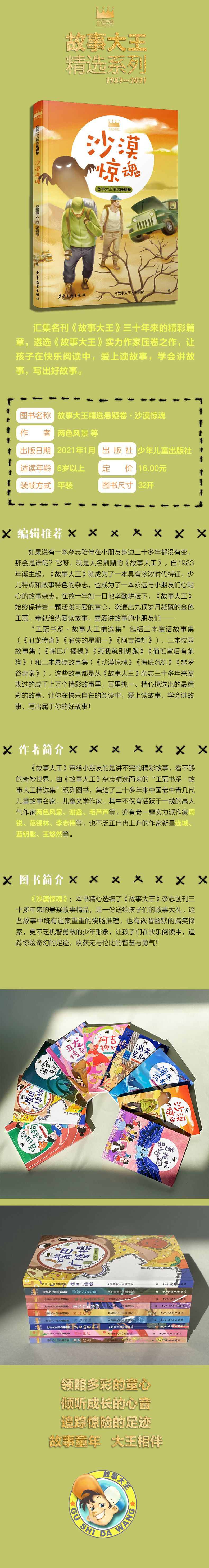 \"沙漠惊魂 周炎青 误入塔克拉玛干深处 那时候,我还是一名小兵,有一次我跟战友姜哥一起驱车进入塔里木盆地。当车子开到塔克拉玛干沙漠边缘地区时,原本晴朗无云的天空突然刮起了沙尘暴,顿时整个沙漠遮天蔽日,周围一片鬼哭狼嚎,真是恐怖。 姜哥是个老兵,看到漫天黄沙铺天盖地朝我们压下来,立即大声吩咐我:“快开车,找地方掩护,不然连人带车都会被埋进沙子里去。” 突然面对这样的场景,我吓得手脚发抖,开着车子在沙漠里四处乱窜,最后终于找到一处巨大的岩壁,将车子停在那儿。 沙尘暴直刮了两天两夜,姜哥一直面色阴沉,看着车窗外的沙尘暴。原来是我胡冲乱撞,把车子开离了车道,误闯进了塔克拉玛干沙漠的深处。这里磁场强烈,我们与部队完全失去通讯联系了。 塔克拉玛干沙漠是个极其危险的地方,每年都有不少的人因为闯入而丢了性命。我该死,竟犯了如此大的错误。我惭愧地望着姜哥,姜哥拍拍我的肩膀说:“在沙漠里,最大的敌人不是沙漠,而是自己,不要慌乱,要时刻保持冷静。” \" \"如果说有一本杂志陪伴在小朋友身边三十多年都没有变,那会是谁呢?它呀,就是大名鼎鼎的《故事大王》。自1983年诞生起,《故事大王》就成为了一本具有浓浓时代特征、少儿特点和故事特色的杂志,也成为了一本永远与小朋友们心贴心的故事杂志。在数十年如一日地辛勤耕耘下,《故事大王》始终保持着一颗活泼可爱的童心,浇灌出9顶岁月凝聚的金色王冠,奉献给热爱读故事、喜爱讲故事的小朋友们—— “王冠书系?故事大王精选集”包括三本童话故事集(《丑龙传奇》《消失的星期一》《阿吉神灯》)、三本校园故事集(《嘴巴广播操》《惹我就别想跑》《值班室后有条狗》)和三本悬疑故事集(《沙漠惊魂》《海底沉机》《噩梦谷奇案》)。这些故事都是从《故事大王》杂志30多年来发表过的成千上万个精彩故事里,百里挑一、精心挑选出的最精彩的故事,让你在快乐自在的阅读中,爱上读故事、学会讲故事、写出属于你的好故事! \"