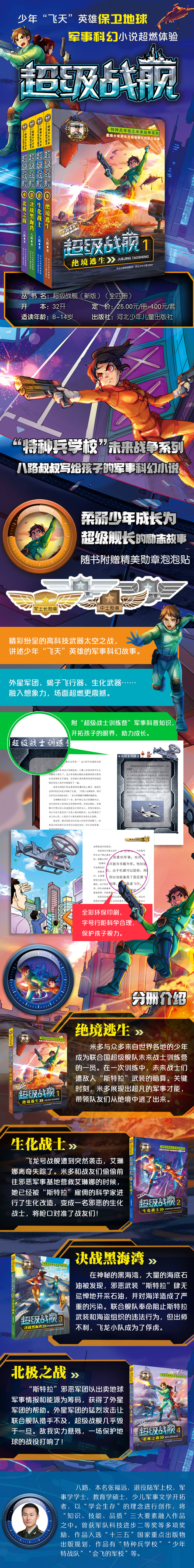 1.“特种兵学校”之未来战争系列,柔弱少年成长为超级英雄的励志故事。 2.著名少儿军事文学作家八路新作,少儿军事科幻小说。 3.每章附“超级战士训练营”军事科普知识,开拓孩子眼界,助力成长。 4.随书附赠超精美酷炫泡泡贴。 5.全彩色环保印刷,字号行距科学合理,保护孩子视力。