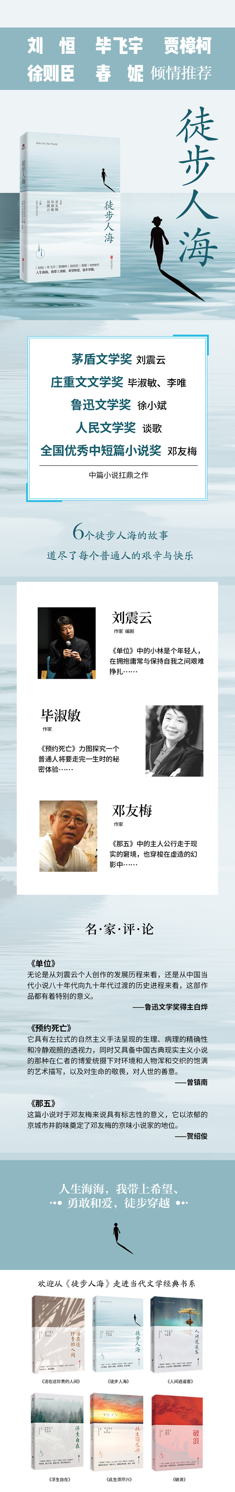 刘震云、毕淑敏、邓友梅等作家中篇小说扛鼎之作,用6小时一口气读完当代文学不可错过的经典。 本书收录的6篇中篇小说,均为当代文学的经典之作。作者包括茅盾文学奖得主刘震云,庄重文文学奖得主毕淑敏,曾连续五年获全国优秀中短篇小说奖的邓友梅等,本书所选均属他们中篇小说的扛鼎之作,也是人们谈论当代文学时不可绕过的经典。 6个徒步人海的故事,道尽了每个普通人的艰辛与快乐。 人生海海,我带上勇敢、希望和爱,徒步穿越。茫茫人海中,我们应该怎样面对自己、处理自己?我们如何度过我们的一生,如何看待我们的命运?这本书也许会让我们获得一份清醒和勇气,帮我们找到一种自己的方式,去和世界相处。 3.名家评论,专业又通俗,让你的阅读更有价值、更有收获。好小说就该这样读! 每篇小说后面附有著名文学评论家的评论,如白烨、贺绍俊等,他们从小说创作背景、作家创作意图、作家创作手法等方面进行专业而有趣的解读,帮我们更轻松、更高效地深入小说世界,真正看清当代优秀中篇小说的风貌。 4.名家推荐:刘恒、毕飞宇、贾樟柯、徐则臣、春妮!