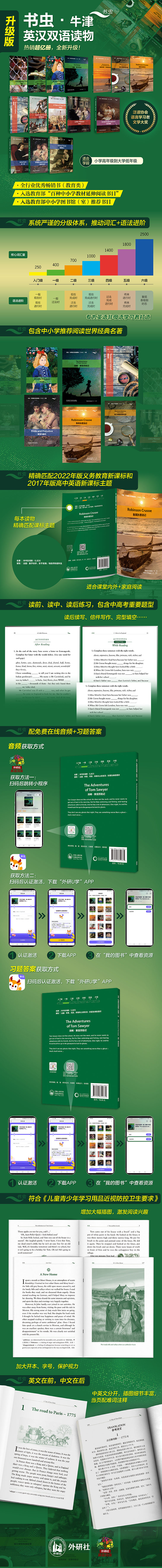 “书虫·牛津英汉双语读物(升级版)”专为非英语母语学习者打造,严格控制语言难度,词汇、语法高频复现并逐级进阶,帮助孩子从250个核心词和简单句开始读懂世界文学名著简写本,直至达到读懂原版小说的水平。 ——100%涵盖义务教育学习主题,且配合主教材学习进度,高效巩固和拓展课堂所学。 ——习题注重思维品质培养,包含中高考重要题型:读后续写、信件写作、完形填空等。 ——文本呈现形式升级,加大开本、字号,增加大幅插图,符合《儿童青少年学习用品近视防控卫生要求》,打造更舒适的阅读体验;中英文分开,英文在前,中文在后,避免中译文干扰英语阅读。 ——配套资源及服务升级,扫码免费获取音频、习题答案,并可参加伴读营和寒暑假打卡,助力“双减”后学生自主学习能力提升。 “书虫·牛津英汉双语读物(升级版)”屡获殊荣: 英语语言学习类读物国际权威大奖——“泛读协会语言学习者文学大奖” 全行业优秀热销书(教育类) 入选“百种中小学教材延伸阅读书目” 入选中小学图书馆(室)推荐书目