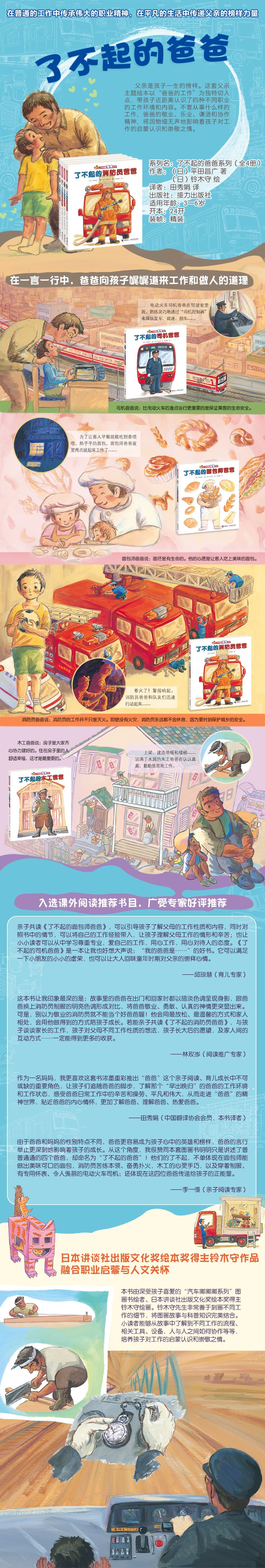 ?暖心的父亲主题绘本——父亲是孩子一生的榜样 本套书以爸爸的职业为独特的切入点,带孩子近距离认识了不同爸爸的工作环境和状态,帮助孩子了解爸爸在家庭之外的另一个身份角色,感受爸爸对待工作的认真、细致和负责。不同岗位上的爸爸,以其敬业、乐业、谦逊和协作的精神,润物细无声地影响着孩子。 ?入选课外阅读推荐书目,广受专家好评推荐 本套书入选中国台湾地区推荐中小学生优良课外读物(图画书类),并得到新阅读研究所研究员、儿童阅读公益机工爱阅团发起人、亲子教育专栏作家李一慢温情推荐。在一言一行中,爸爸向孩子娓娓道来了工作的道理和做人的道理。这些,将成为孩子人生中最宝贵的财富。 ?知名画家铃木守作品,融合职业启蒙与人文关怀 本套书由深受孩子喜爱的“汽车嘟嘟嘟系列”图画书绘者、日本讲谈社出版文化奖绘本奖得主铃木守绘画。铃木守先生非常善于刻画不同工作的细节,将图画故事与科普知识完美结合。 本套书涉及了电动火车司机、消防员、面包师和木工师傅等不同的职业,小读者能够从故事中了解到不同工作的流程、相关工具、设备,人与人之间如何协作等等,培养孩子对工作的启蒙认识和崇敬之情。