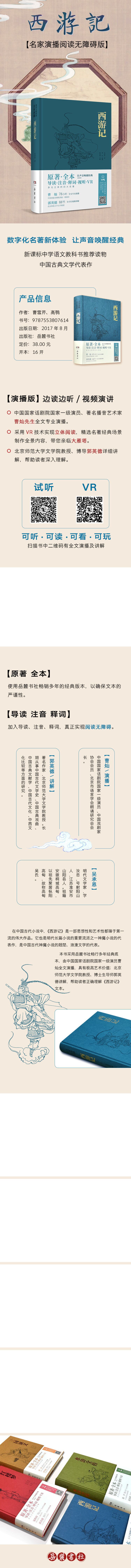 本书采用岳麓书社畅行多年经典底本,由中国国家话剧院国家一级演员曹灿全文演播,具有极高艺术价值;北京师范大学文学院教授、博士生导师郭英德讲解,帮助读者正确理解《西游记》文本。 本书采用最新VR技术,精选名著经典场景制作全景内容,让读者身临其境,增添阅读趣味性。