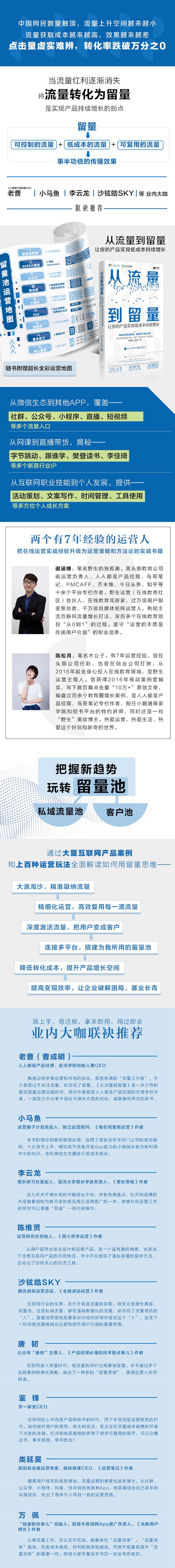谢涵博:笔名野生的独孤菌。某头部教育公司前运营负责人,人人都是产品经理、鸟哥笔记、PMCAFF等平台专栏作家。野生运营合伙人,在线教育观察家,过万级用户裂变策划者,千万级自媒体矩阵运营人,熟知主流互联网流量增长打法,亲历多个在线教育项目“从0到1”的过程。坚守“运营的本质是传递用户价值”的职业信条。 陈松月:笔名木公子。有7年运营经验,曾在头部公司任职,也曾在创业公司打拼,从2016年起全身心投入在线教育领域,是野生运营主理人。曾获得2016年最佳移动案例营销奖,写下数百篇点击量“10万+”原创文章,操盘过百余个教育圈增长案例,是人人都是产品经理、鸟哥笔记专栏作者,担任小鹅通商家学院和短书平台的特约讲师,同时还是一枚“野生”美妆博主。热爱运营,热爱生活,热爱这个好玩和新奇的世界。