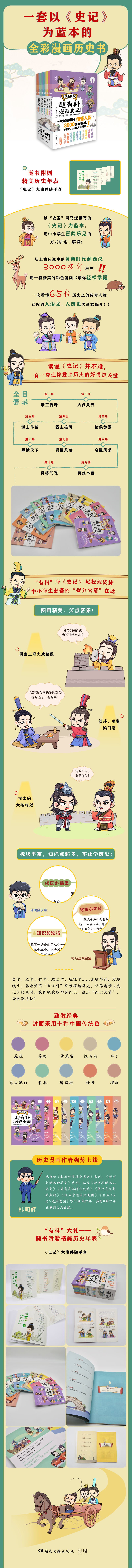 ?历史漫画界红人韩明辉老师新作,“超有料”系列新作重磅面世!读懂《史记》并不难,有一套让你爱上历史的好书是关键。跟着韩老师看漫画学《史记》,轻松掌握历史知识,一口气认识上古传说中的黄帝时代到汉武帝3000多年间的风云人物。 ?中小学生“知识火箭”来啦!这里有——史学、文学、哲学、政治学、地理学......旁征博引,妙趣横生,韩老师用“大文科”思维解读历史,让你看懂《史记》的同时疯狂吸收各学科知识。坐上“知识火箭”,分数涨得快! ?板块丰富,图画精美,语言风趣,笑点密集。每个历史人物都有精心设计的形象和对话,所有知识点融进了幽默的对话里。每个篇章的结尾都有精炼的点评,看完段子,轻松get《史记》原文主旨。