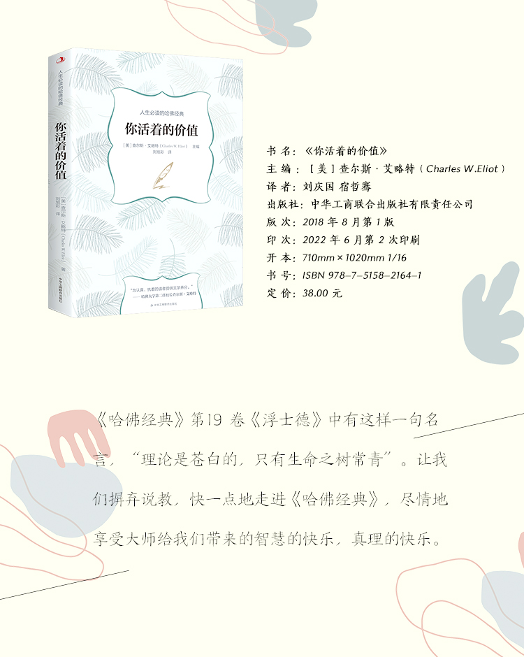 人生必读的哈佛经典:你活着的价值 出版时间 0002-11-30T00:00 成功学 46716 作者: (美)查尔斯·艾略特 主编,刘旭彩 译 出版社: 工商联 原售价: 38.00 折扣价: 12.16 折扣购买: 人生必读的哈佛经典:你活着的价值 ISBN: 978751582164101 作者简介 内容简介 上一篇:脱发自救指南下一篇:心路(从大学看人生)/东方生命智慧教育系列