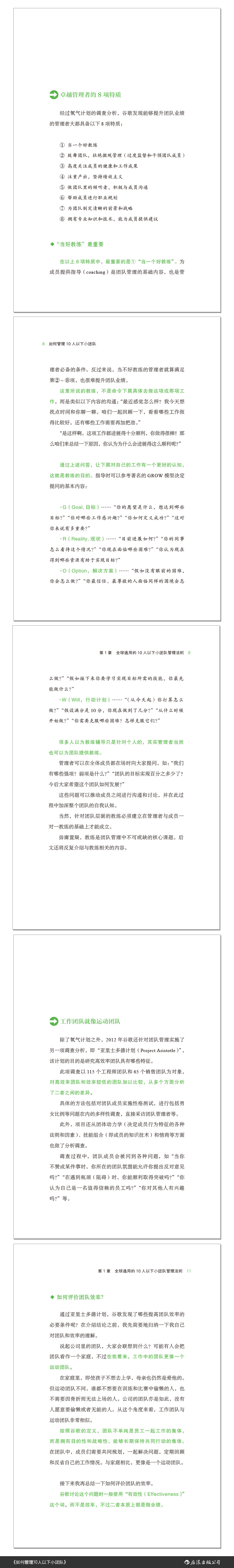 优异业绩离不开集体智慧 在美国商业杂志《财富》每年评选的最适宜工作的 100 家公司中,谷歌曾多次名列第一(2017 年、2016 年、2015 年、2014 年等)。这家公司究竟什么地方这么吸引人呢? 是免费的员工餐厅、按摩室,或者是因为福利待遇好吗? 应该都不是。那么是因为有自由的思考空间,可以尽情发挥个人能力吗?可能很多人都对谷歌持有这样的印象。 我曾在谷歌担任亚太地区的人才培训主管,参与制定国际化人才培养战略,从我的实际感受来看,应该也不是因为这一点。 ◆谷歌的最大魅力其实是重视团队 如今,在全球商业的最前线,越来越多的人开始重视和反思团队管理的重要意义。为什么会出现这种趋势呢? 因为要想在当下日新月异的竞争中取得卓越成绩,富含多样性的集体智慧必不可少。 其背后的道理显而易见。一个人能做到的事情终归有限, 从两个人增加到 3 个人,从 3 个人增加到 4 个人,做出成果的可能性会越来越大。集体智慧不是单纯的加法,而是乘法, 能带来指数级增长。 要产生超乎寻常的协同效应,必须靠团队的集体智慧去思考和行动。统领团队的管理者的作用至关重要,这在谷歌也不例外。 ◆优秀的团队不需要管理者吗 相信很多人会有这样的疑问:既然有如此优秀的人才, 为什么还要管理者?搞团队合作还不如大家各干各的吧? 其实谷歌内部也曾有人提出过这种观点,而且最坚决的支持者不是别人,正是创始人拉里·佩奇和谢尔盖·布林。他们曾经质疑:“团队不需要管理者吧?你看,我们的员工个个都是斯坦福等名校毕业,头脑极为聪明,价值观也很端正, 即使没有管理者,他们自己也能无往不胜。管理者除了花费成本,还能起到什么作用呢?” 人力部门负责人被这番话吓了一跳:“不,管理者的作用是不可替代的,他们维系着团队的运转!” “是这样吗?有科学依据吗?” 凡事都要有依据,追本溯源,这就是谷歌的企业文化。 谷歌作为一家互联网企业,拥有博士学位的员工所占的比例据说在全球居首位,比美国航空航天局还高,所以有这样的企业文化也是在情理之中的。在这里工作的人都很像学者,或者说基本都是学者,他们拥有旺盛的求知欲,讨论任何问题,都要拿证据说话,主张靠毅力和坚持取胜的论调在谷歌是根本行不通的。 就这样,谷歌在 2009 年就管理者职责和工作内容实施了一项内部调查,规模涉及1 万人,这就是“氧气计划(Project Oxygen)”。 ◆管理者对团队业绩影响最大 谷歌有很多成果丰硕的团队,当然也有战绩平平的团队。同样都是优秀的员工,为什么会出现这么大的差距?例如有一种很常见的情况是有的员工在某个团队取得了很多成果,调到另一个团队后却表现不佳。这是为什么呢?人力部门一向重视管理者的作用,他们猜测问题出在统率团队的管理者身上。 调查的初步结果证实了人力部门的假设:对团队成员的业绩影响最大的是管理者的言行。 “是这样啊。那么就请你们再多提出一些依据,以便今后培养和聘用管理者时遵循。”这是拉里·佩奇和谢尔盖·布林得知上述结论之后提出的要求(这也是他们的过人之处,在科学依据面前果断放弃自己的预判和偏见,立即调整方针)。于是,谷歌又实施了进一步调查,分析那些业绩斐然的团队管理者都做了哪些工作。 卓越管理者的 8 项特质 经过氧气计划的调查分析,谷歌发现能够提升团队业绩的管理者大都具备以下 8 项特质: ① 当一个好教练 ② 鼓舞团队,杜绝微观管理(过度监督和干预团队成员) ③ 高度关注成员的健康和工作成果 ④ 注重产出,坚持绩效主义 ⑤ 做团队里的倾听者,积极与成员沟通 ⑥ 帮助成员进行职业规划 ⑦ 为团队制定清晰的前景和战略 ⑧ 拥有专业知识和技术,能为成员提供建议 ◆“当好教练”最重要 在以上 8 项特质中,最重要的是①“当一个好教练”。为成员提供指导(coaching) 是团队管理的基础内容, 也是管理者必备的条件。反过来说,当不好教练的管理者就算满足第② ~ ⑧项,也很难提升团队业绩。 这里所说的教练,不是命令下属具体去做这项或那项工作,而是类似以下内容的沟通:“最近感觉怎么样?我今天想找点时间和你聊一聊。咱们一起回顾一下,看看哪些工作做得比较好,还有哪些工作需要再加把劲。” “是这样啊。这项工作都进展得十分顺利,你做得很棒!那么咱们来总结一下原因,你认为为什么会进展得这么顺利呢?” 通过上述问答,让下属对自己的工作有一个更好的认知, 这就是教练的目的。指导时可以参考著名的 GROW 模型决定提问的基本内容: ·G(Goal, 目标)……“你的愿望是什么,想达到哪些目标?”“你对哪些工作感兴趣?”“你如何定义成功?”“这对你来说有多重要?” ·R(Reality, 现状)……“目前进展如何?”“你的同事怎么看待这个情况?”“你现在面临哪些困难?”“你认为现在得到哪些资源有助于实现目标?” ·O(Option, 解决方案)……“假如没有眼前的困难, 你会怎么做?”“你最信任、最尊敬的人面临同样的困境会怎么做?”“假如接下来你要学习实现目标所需的技能,你最先能做什么?” ·W(Will, 行动计划)……“(从今天起)你打算怎么做?”“假设满分是 10 分,你现在做到了几分?”“从什么时候开始做?”“你需要克服哪些困难?怎样克服它们?” 很多人以为教练辅导只是针对个人的,其实管理者当然也可以为团队提供教练。 管理者可以在全体