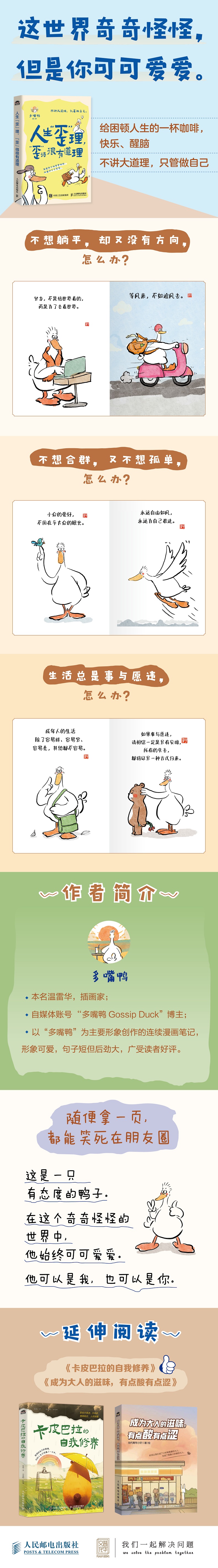 这本书就像给困顿人生的一杯咖啡--快乐、醒脑。 本书中的漫画,随便拿一页,都能笑死在朋友圈。 这是一只有态度的鸭子, 关于成长、关于情绪、关于社交、关于生活,以及关于上班和下班, 他有很多出人意料又引人深思的观点, 这世界越来越奇奇怪怪,但他始终可可爱爱, 他可以是你,也可以是我。