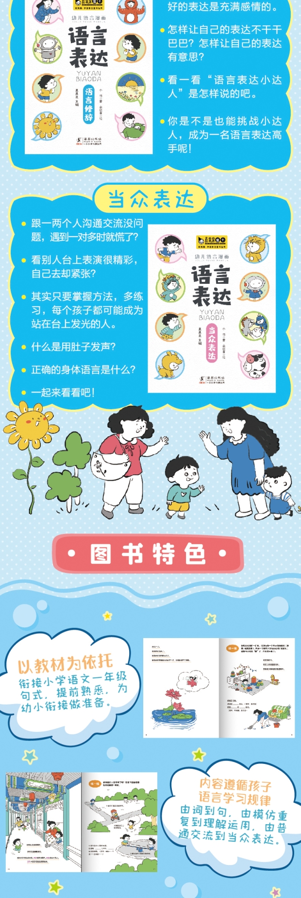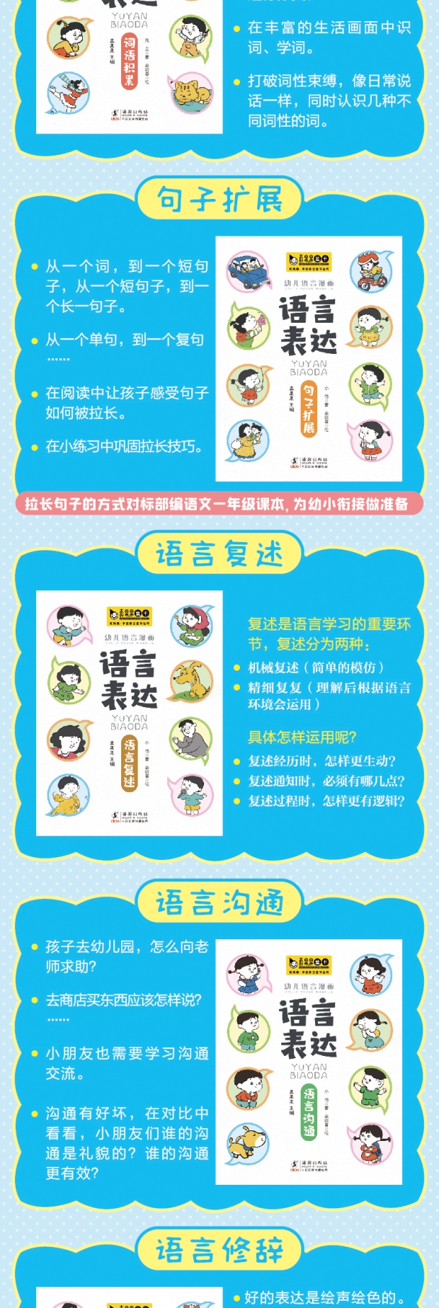语言学习的规律是什么?这套书遵循的理论依据是: ? 孩子的语言学习规律: ? 由字词到句,由易到难;(对应我们的《词语积累》《句子扩展》《语言修辞》) ? 由机械复述到精确复述和有效沟通;(对应我们的《语言复述》《语言沟通》) ? 由与一两个人沟通,到当众表达。(对应我们的《当众表达》)