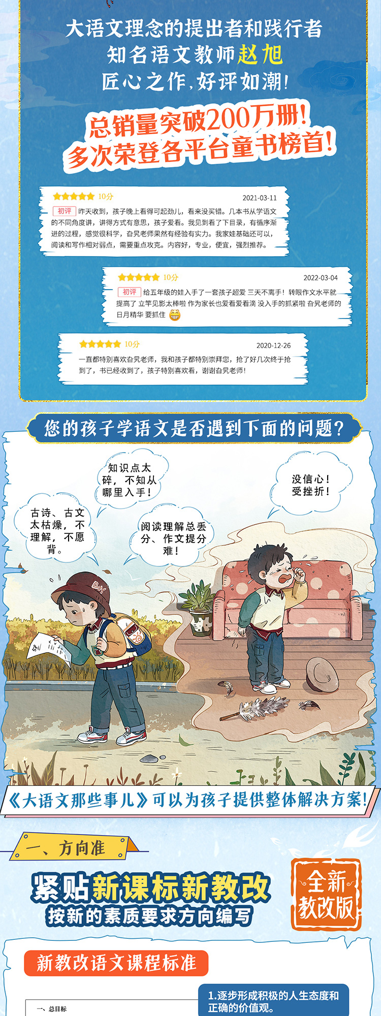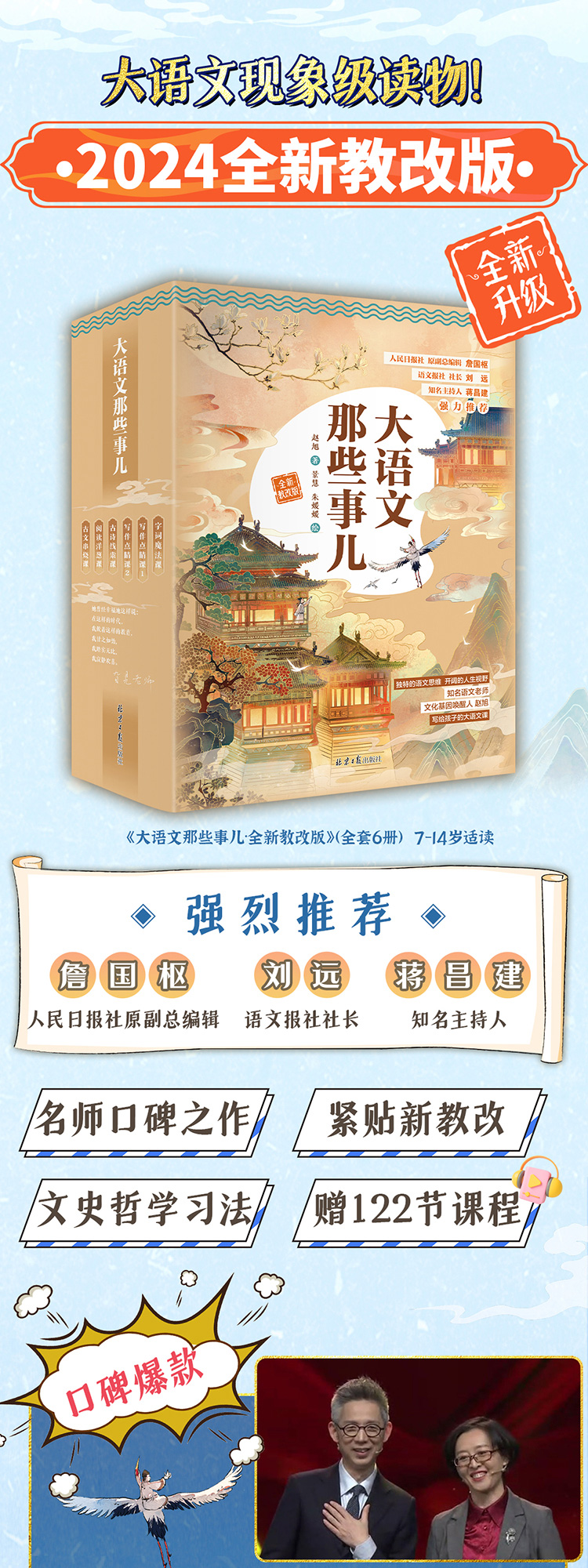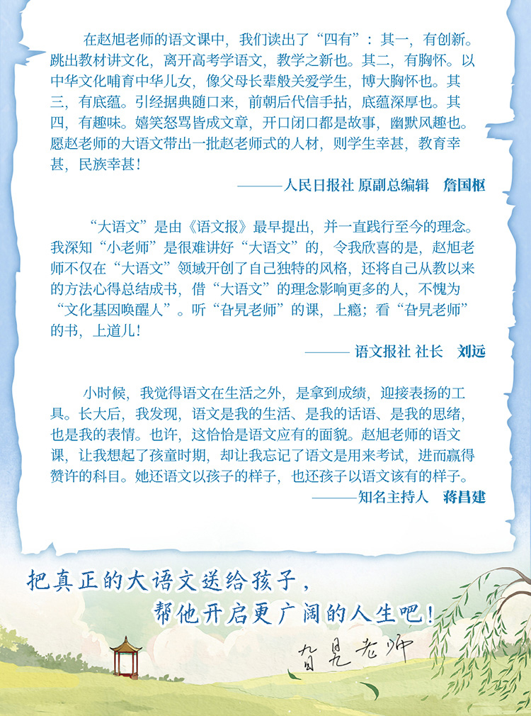 1.好评如潮,大语文现象级读物! 2.知名语文老师、文化基因唤醒人赵旭写给孩子的大语文课 3.有深度又有广度,严谨又风趣的必备课外书 4.紧跟全新教育改革大语文的教改方向编写 5.涉及部编版教材中100+篇目 6.“点线面”语文教学法,培养语文思维和综合语文素养 7.文史哲三维一体,搭建立体文化知识网 8.字词、作文、阅读、古诗、古文一网打尽 “大语文”是由《语文报》最早提出,并一直践行至今的理念。我深知“小老师”是很难讲好“大语文”的,令我欣喜的是,赵旭老师不仅在“大语文”领域开创了自己独特的风格,还将自己从教以来的方法心得总结成书,借“大语文”的理念影响更多的人,不愧为“文化基因唤醒人”。听“旮旯老师”的课,上瘾;看“旮旯老师”的书,上道儿! ——语文报社 社长 刘远 在赵旭老师的语文课中,我们读出了“四有”:其一,有创新。跳出教材讲文化,离开高考学语文,教学之新也。其二,有胸怀。以中华文化哺育中华儿女,像父母长辈般关爱学生,博大胸怀也。其三,有底蕴。引经据典随口来,前朝后代信手拈,底蕴深厚也。其四,有情趣。嬉笑怒骂皆成文章,开口闭口都是故事,幽默风趣也。愿赵老师的大语文带出一批赵老师,则学生幸甚,教育幸甚,民族幸甚! ——人民日报社 原副总编辑 詹国枢 小时候,我觉得语文在生活之外,是拿到成绩,迎接表扬的工具。长大后,我发现,语文是我的生活、是我的话语、是我的思绪,也是我的表情。也许,这恰恰是语文应有的面貌。赵旭老师的语文课,让我想起了孩童时期,却让我忘记了语文是用来考试,进而赢得赞许的科目。她还语文以孩子的样子,也还孩子以语文该有的样子。 ——知名主持人 蒋昌建