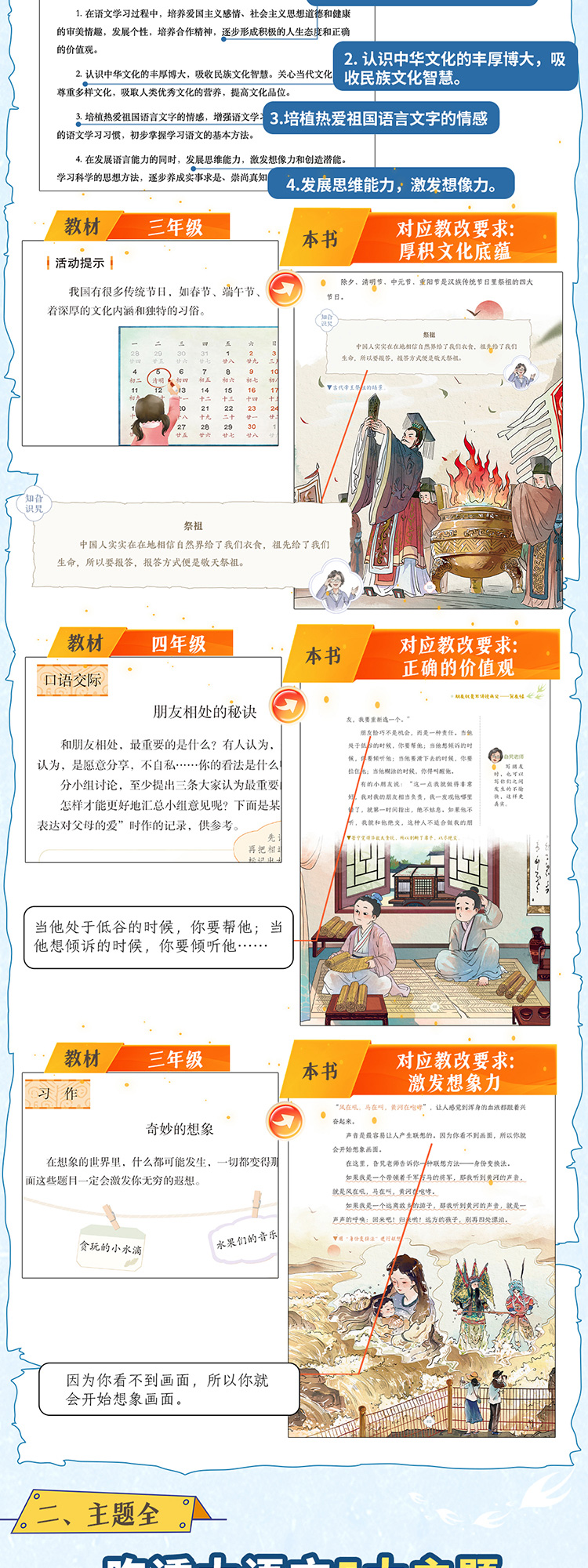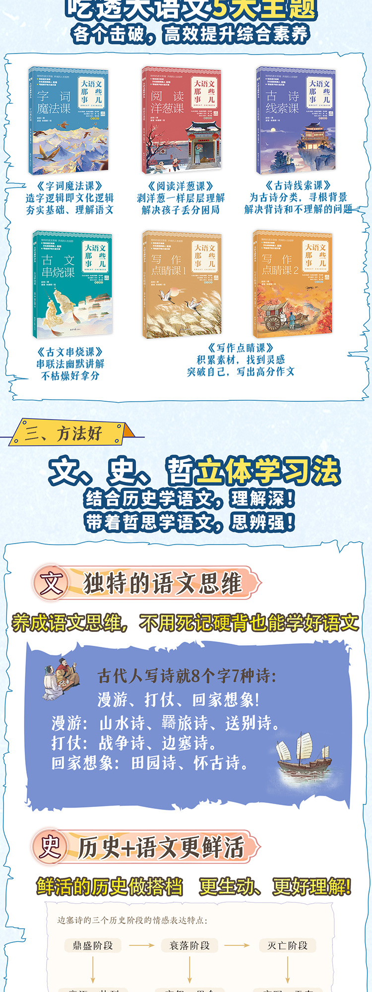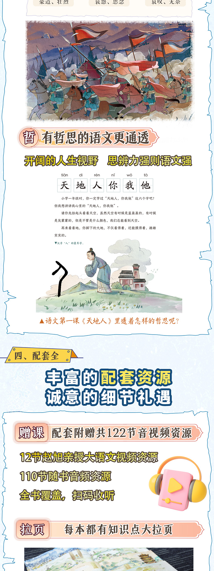 1.好评如潮,大语文现象级读物! 2.知名语文老师、文化基因唤醒人赵旭写给孩子的大语文课 3.有深度又有广度,严谨又风趣的必备课外书 4.紧跟全新教育改革大语文的教改方向编写 5.涉及部编版教材中100+篇目 6.“点线面”语文教学法,培养语文思维和综合语文素养 7.文史哲三维一体,搭建立体文化知识网 8.字词、作文、阅读、古诗、古文一网打尽 “大语文”是由《语文报》最早提出,并一直践行至今的理念。我深知“小老师”是很难讲好“大语文”的,令我欣喜的是,赵旭老师不仅在“大语文”领域开创了自己独特的风格,还将自己从教以来的方法心得总结成书,借“大语文”的理念影响更多的人,不愧为“文化基因唤醒人”。听“旮旯老师”的课,上瘾;看“旮旯老师”的书,上道儿! ——语文报社 社长 刘远 在赵旭老师的语文课中,我们读出了“四有”:其一,有创新。跳出教材讲文化,离开高考学语文,教学之新也。其二,有胸怀。以中华文化哺育中华儿女,像父母长辈般关爱学生,博大胸怀也。其三,有底蕴。引经据典随口来,前朝后代信手拈,底蕴深厚也。其四,有情趣。嬉笑怒骂皆成文章,开口闭口都是故事,幽默风趣也。愿赵老师的大语文带出一批赵老师,则学生幸甚,教育幸甚,民族幸甚! ——人民日报社 原副总编辑 詹国枢 小时候,我觉得语文在生活之外,是拿到成绩,迎接表扬的工具。长大后,我发现,语文是我的生活、是我的话语、是我的思绪,也是我的表情。也许,这恰恰是语文应有的面貌。赵旭老师的语文课,让我想起了孩童时期,却让我忘记了语文是用来考试,进而赢得赞许的科目。她还语文以孩子的样子,也还孩子以语文该有的样子。 ——知名主持人 蒋昌建