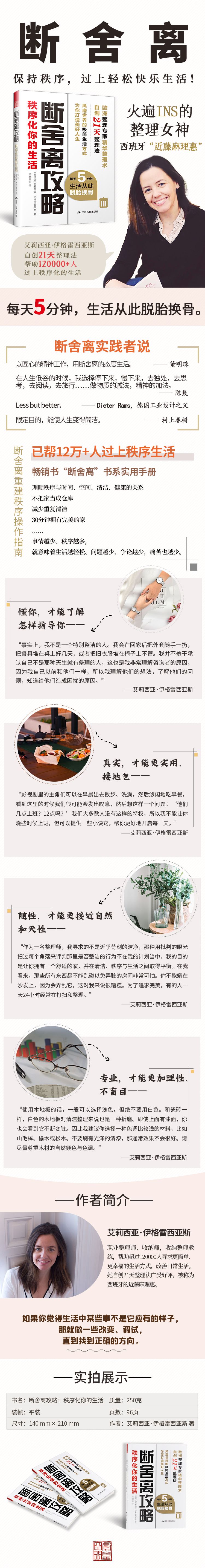 让天生爱干净的人做好整理不难,难的是让天生没有整理细胞的人生活得有规律、有秩序。本书作者艾莉西亚?伊格雷西亚斯坦言自己就是一个进了家门就随手丢外套的人,怎么样,是不是感觉一下子拉近了和作者的距离?但是作者如今成为了一位著名整理师,还独创了一套21天整理法,这个故事是不是很励志? 事实上,人的天性是懒惰的,整理、规律并不是人们天生就喜欢的,同时,也没有人希望自己的家混乱得像猪圈一样。那么,如何在既不过分约束天性又能让家里保持一定秩序,从而让自己生活得轻松、快乐而愉悦呢?来看这本书吧,本书将会教给你如何在生活最有必要的方面建立秩序,一个灵活的不会成为我们生活桎梏的秩序,既让生活能够按规律开展,又不会让我们因为遵守秩序而烦恼,这就是本书的秘诀。