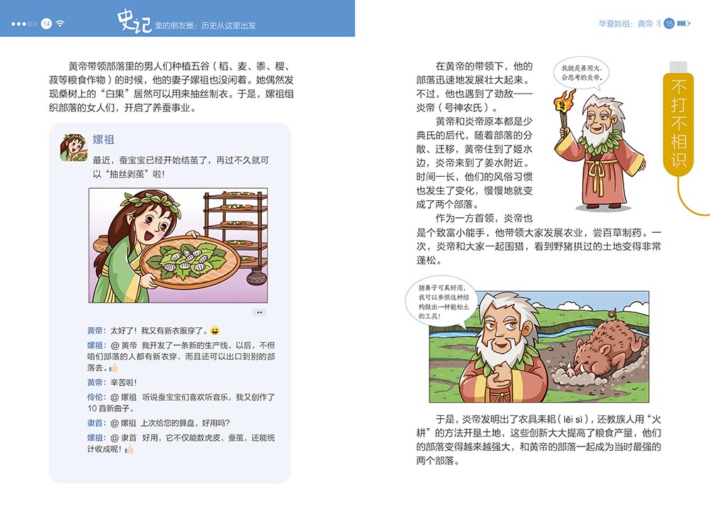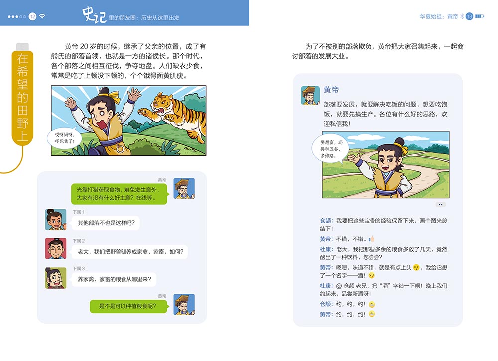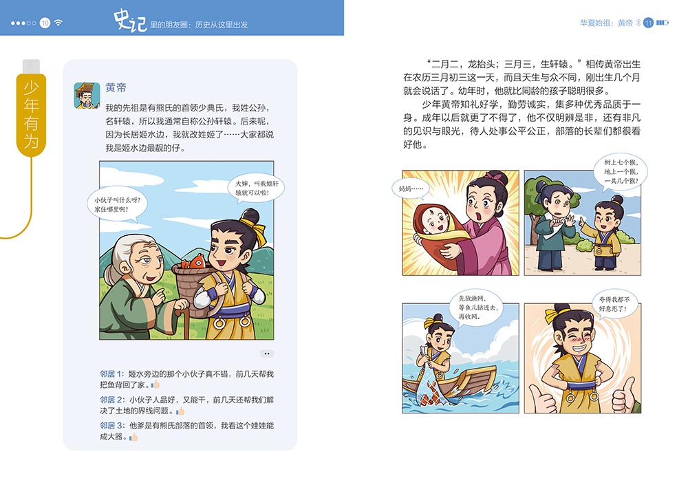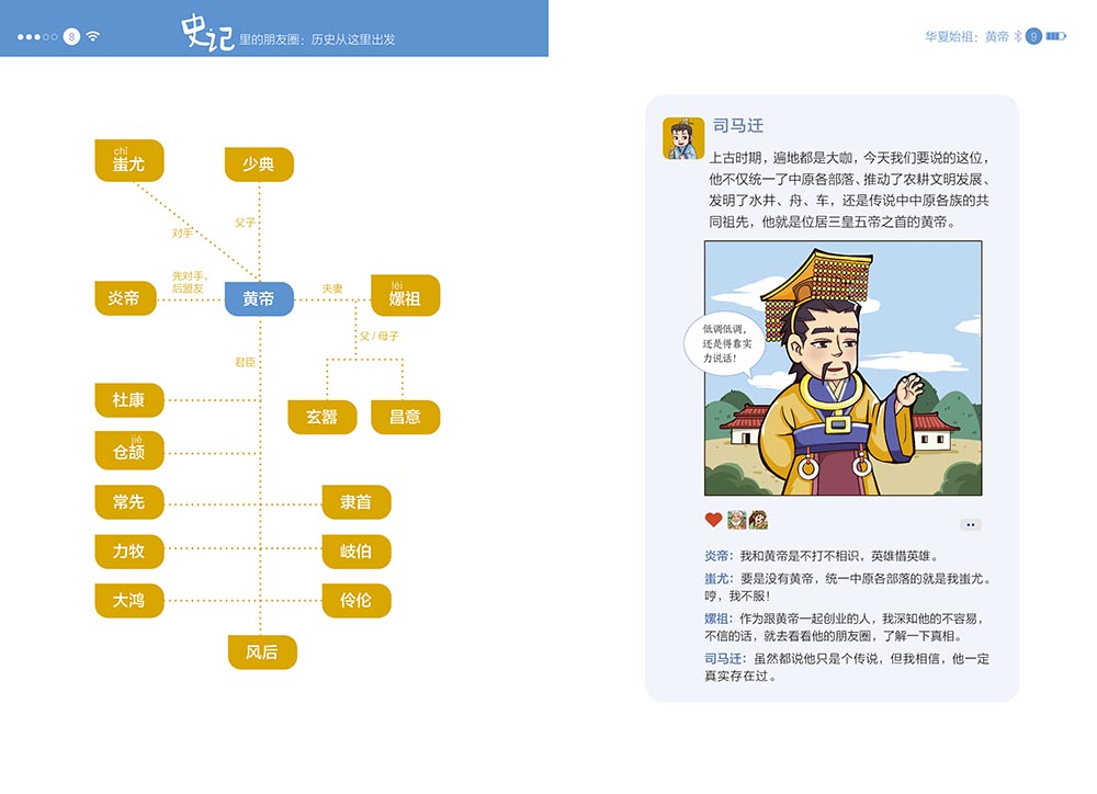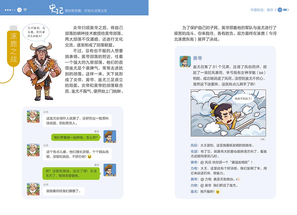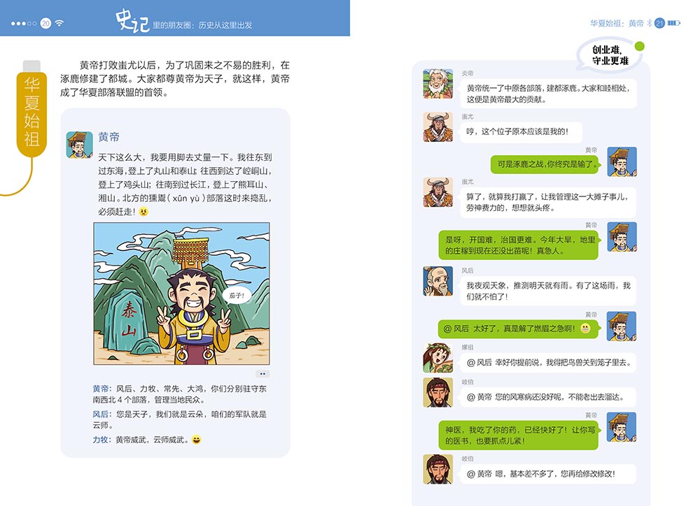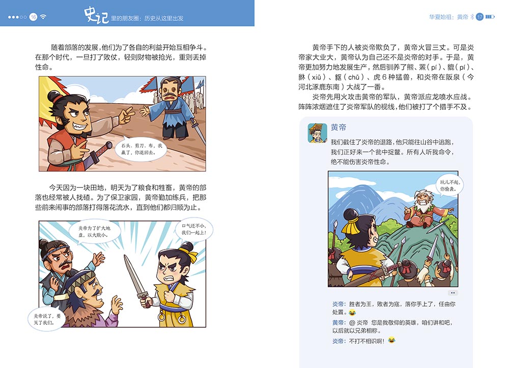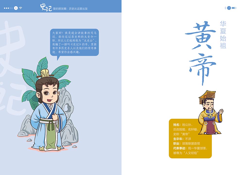 “史记里的朋友圈”共5册,精选了61个代表人物。本书以司马迁的《史记》为基础,采用当下孩子们最喜欢的社交方式——朋友圈和群聊,以历朝历代的重要历史人物为线索,让历史人物和他的“朋友们”一起,用趣味横生的语言、幽默生动的漫画来讲述有趣有料的历史故事,帮助孩子们轻松、无压力地爱上历史,清晰掌握历史的发展脉络,同时为孩子们古文学习、成语积累、写作谋篇奠定坚实的基础。