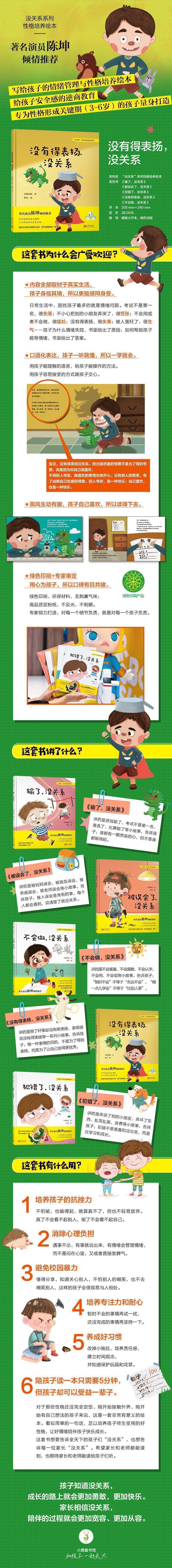 这套“没关系”系列性格培养绘本,为爸爸妈妈们提供了一种积极、健康的家教理念。一个个生活情景的再现,让爸爸妈妈们在家庭教育中有章可循:遵循平等的原则,孩子的想法应该被尊重,需求应该被满足,错误应该被原谅。 将这套绘本读给孩子听,让孩子真切地感受到自己被爸爸妈妈理解、接纳、鼓励、帮助,良好的亲子关系便会从此开启了。孩子们会在书中看到自己,学会解决问题的方法;爸爸妈妈举一反三,遇到问题时能找到应对策略和教育方法。 愿所有的爸爸妈妈开启一段美好的亲子时光,共同享受生命成长的过程,用心孕育出美好的亲子关系。